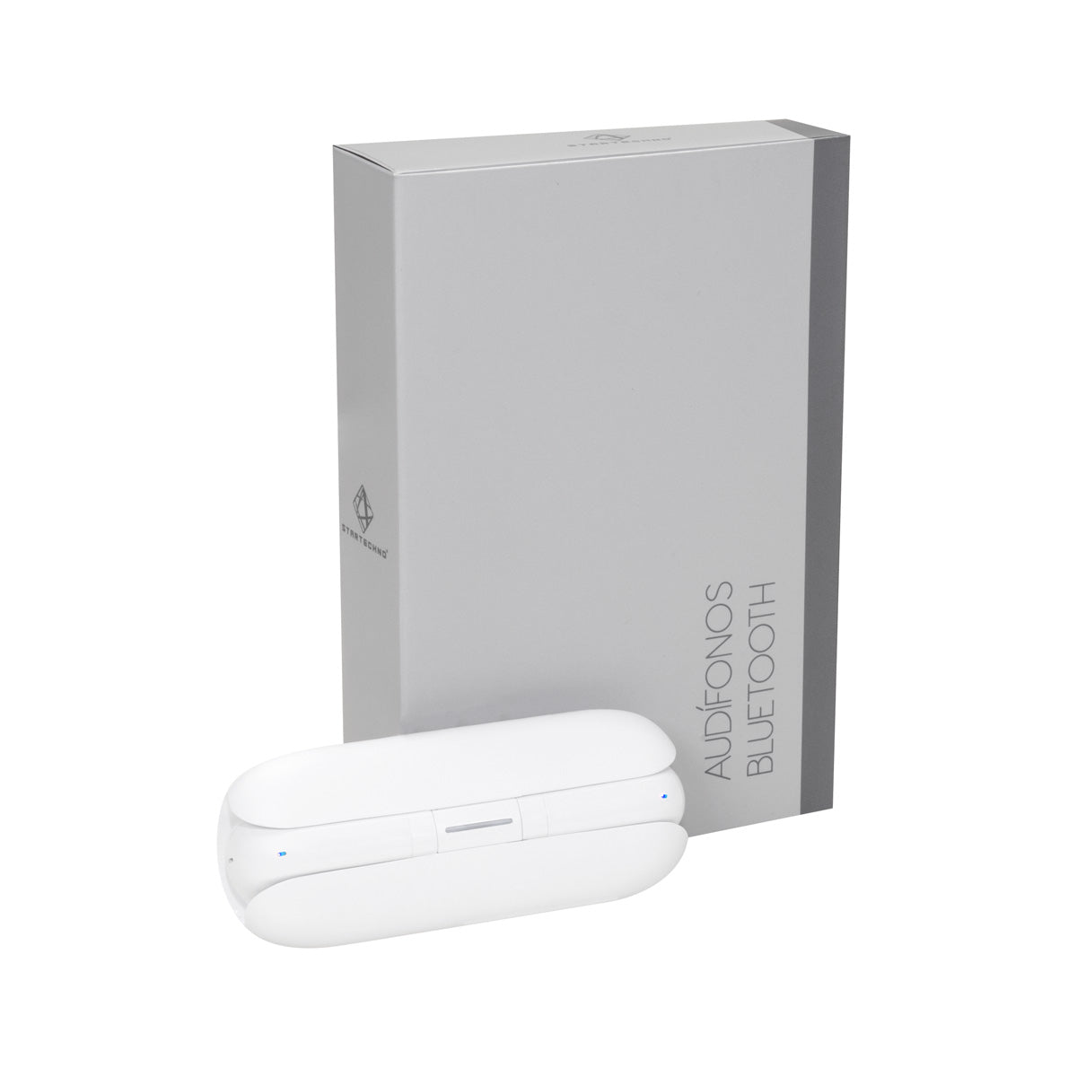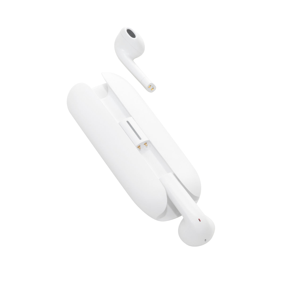 Audífonos bluetooth con base recargable. Controles integrados touch para llamadas, volumen y reproducción de audio. Reproducción de música de 4 hrs aproximadamente. Rango de conexión de 10 metros. Batería de 30 mAh en los auriculares y 200 mAh en el estuche de carga. Incluye cable cargador USB, estuche de carga con conexión tipo C y caja individual.