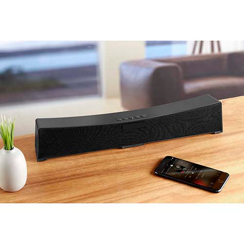 Mini barra de sonido bluetooth de con dos bocinas de 5W de potencia cada una. Bateria recargable con duracion de 10 hrs aproximadamente. Controles integrados de llamada, volumen y reproduccion de audio. Entrada de tarjeta microSD, modo radio FM y funcion manos libres. Cable cargador micro USB y cable de audio incluidos.
