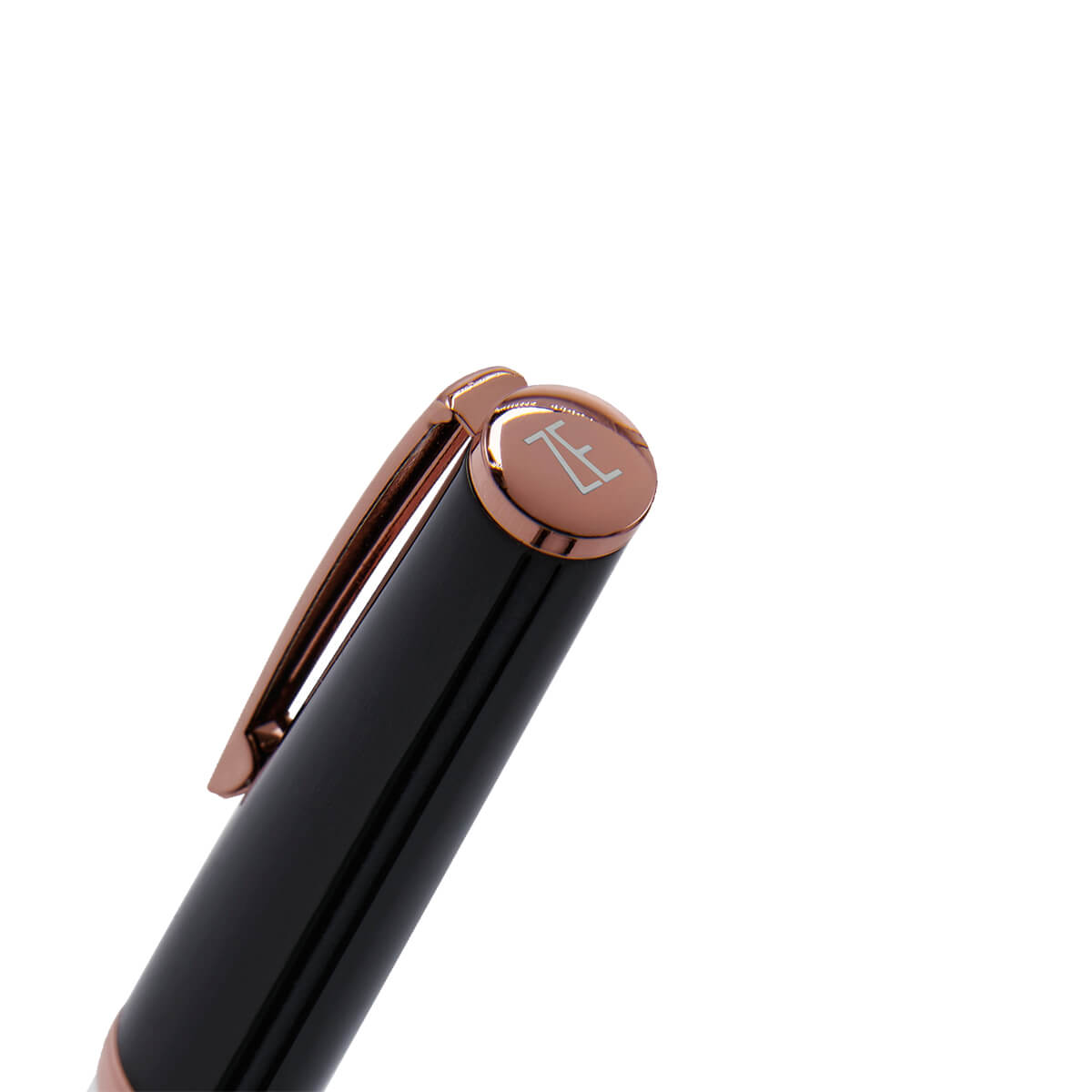 Bolígrafo metálico con tapón. Cuerpo en color blanco con punta dorada. Tapón en color negro y clip dorado. Incluye funda.