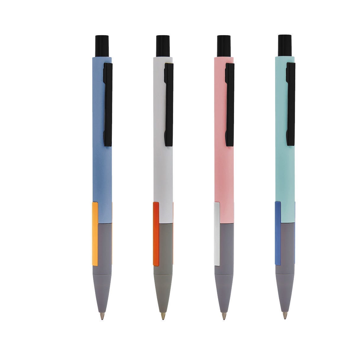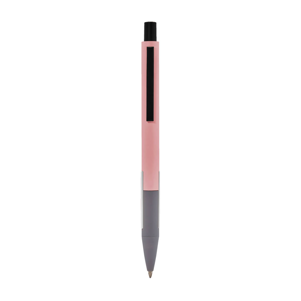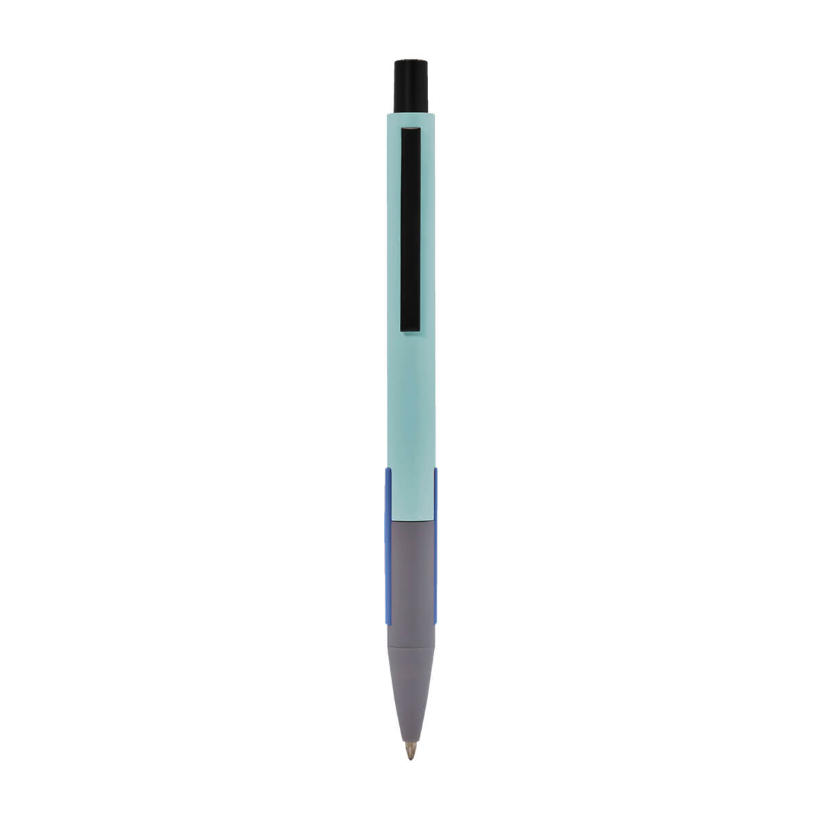 Bolígrafo con barril combinado en color y punta gris. Botón y clip color negro. Grip de plástico en color. Mecanismo push. Incluye funda.