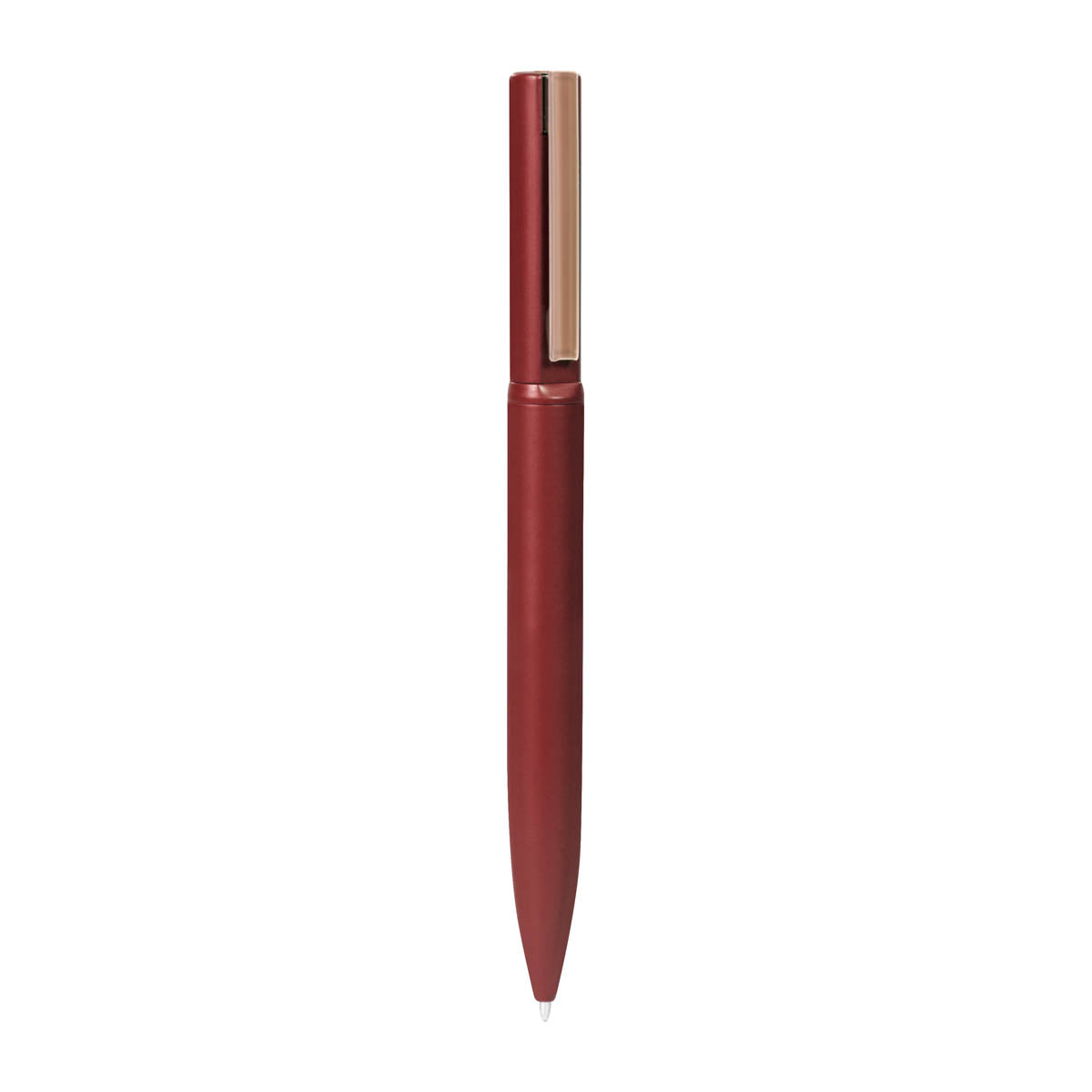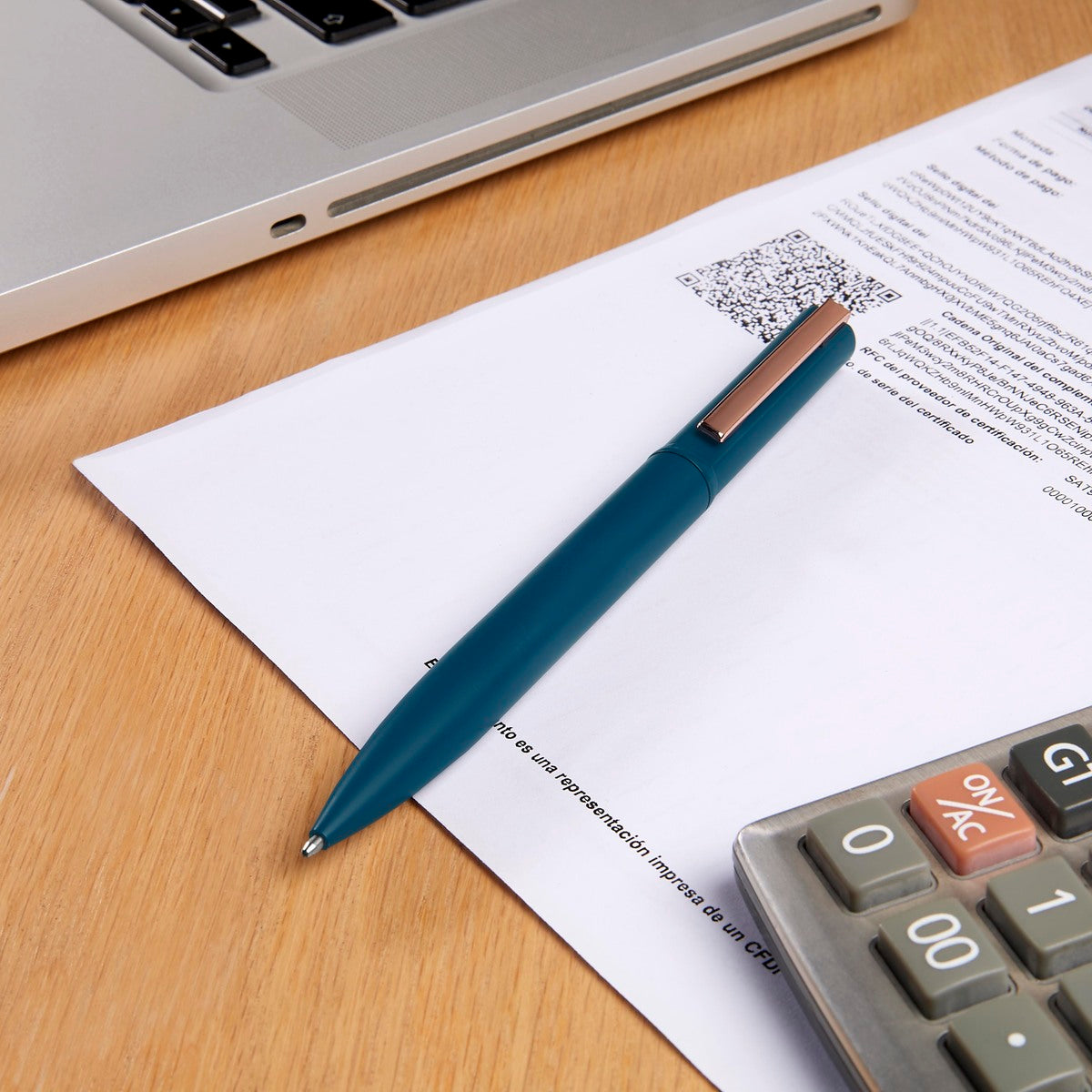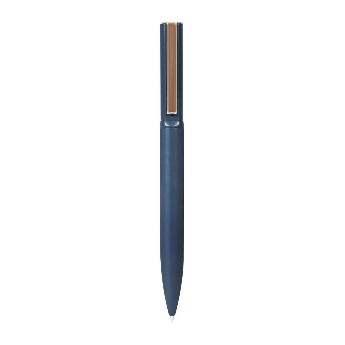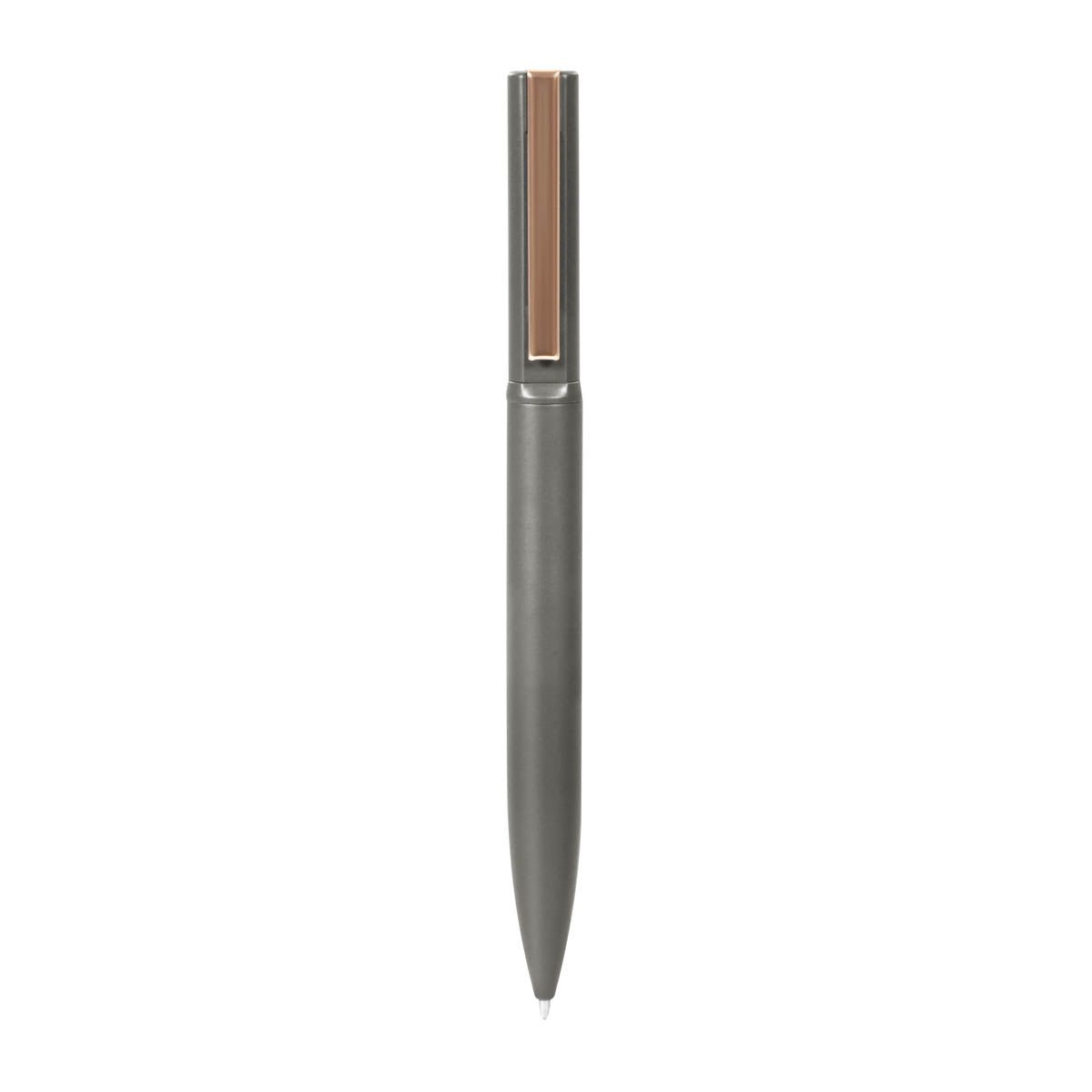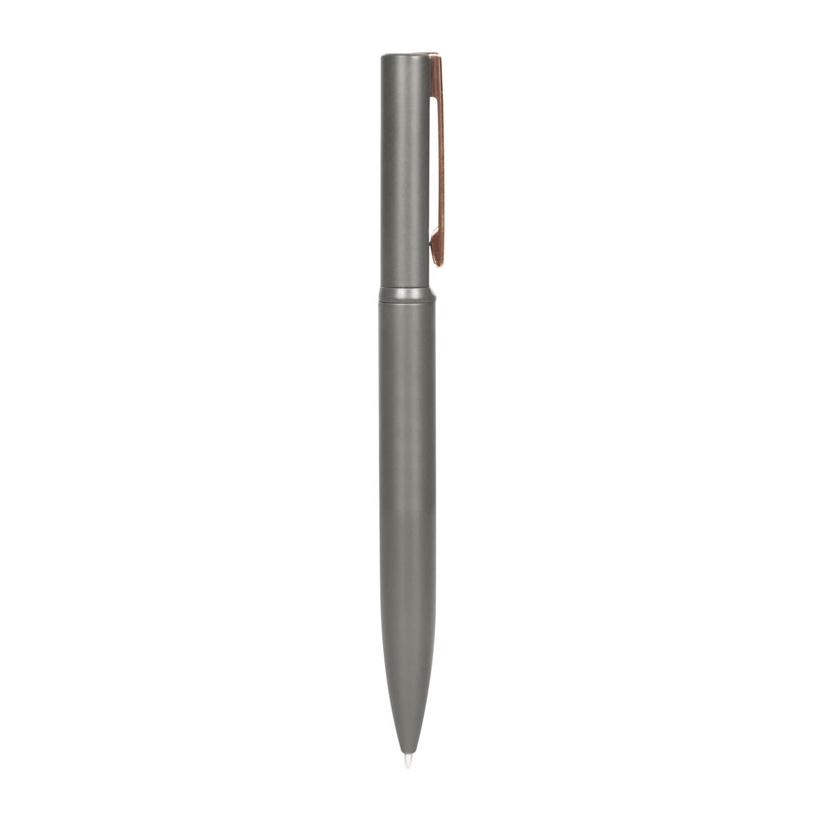 Bolígrafo metálico con terminado mate y clip rose gold. Mecanismo twist. Incluye estuche.