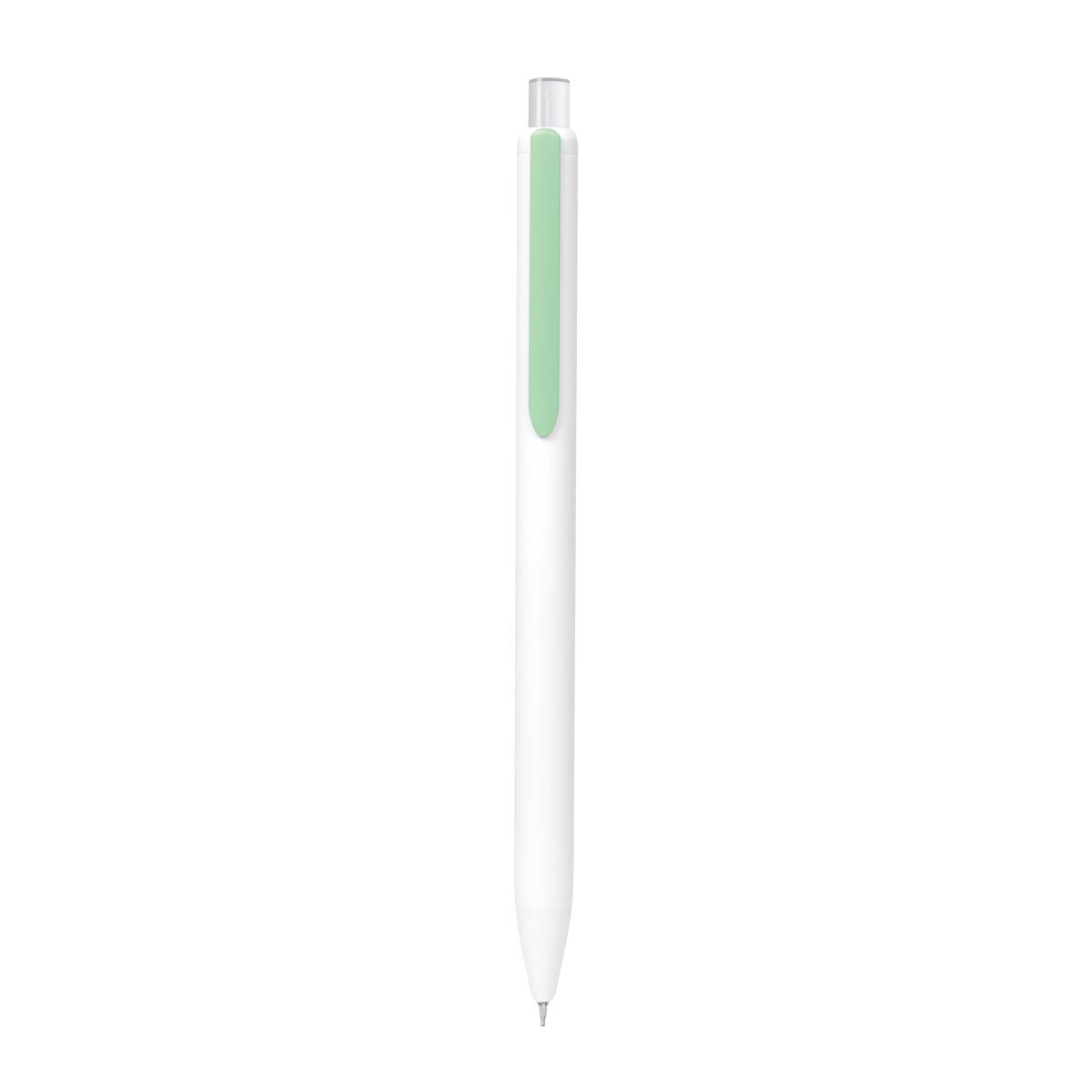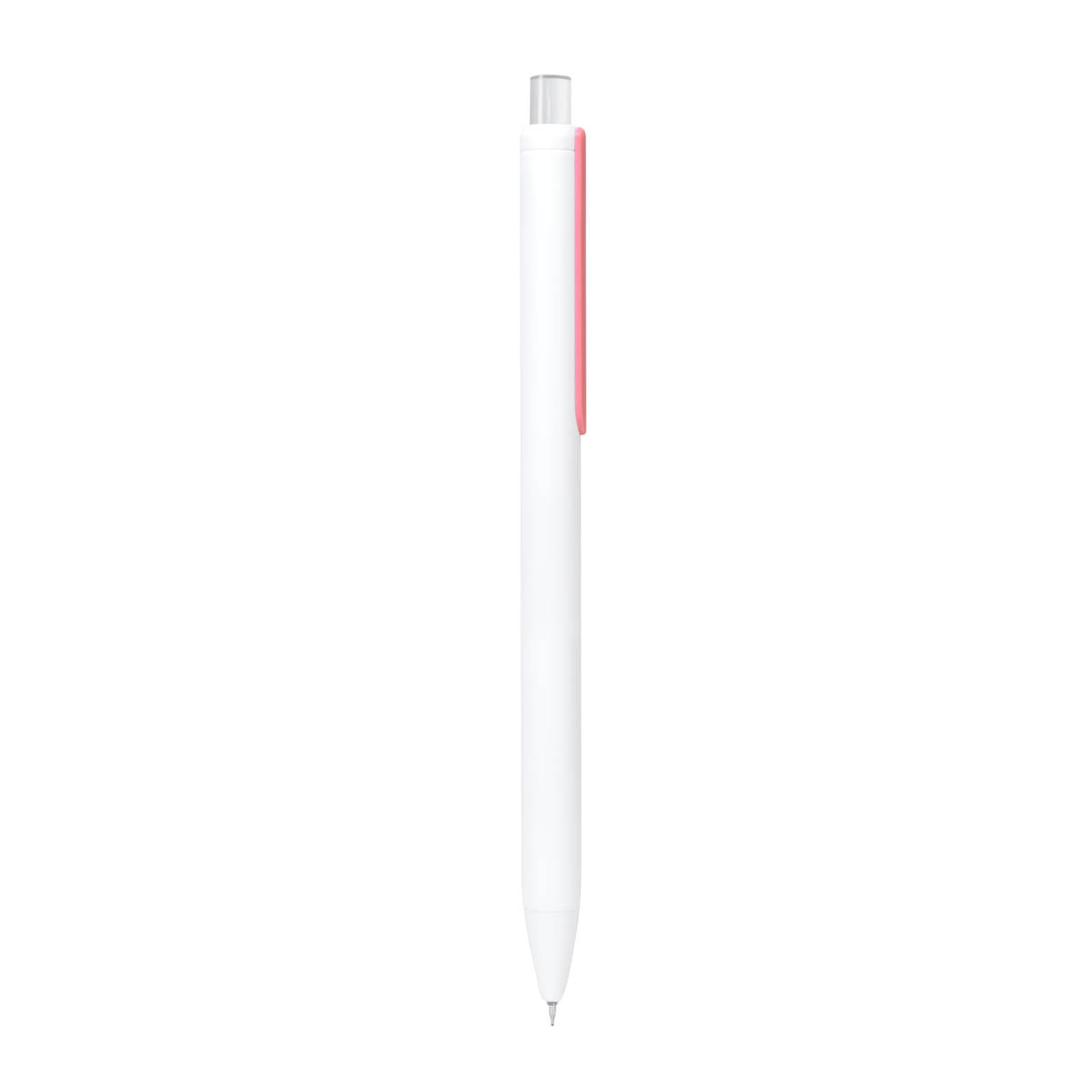 Bolígrafo con tinta semigel. Clip simulado que añade un toque de color moderno. Mecanismo pulsador.