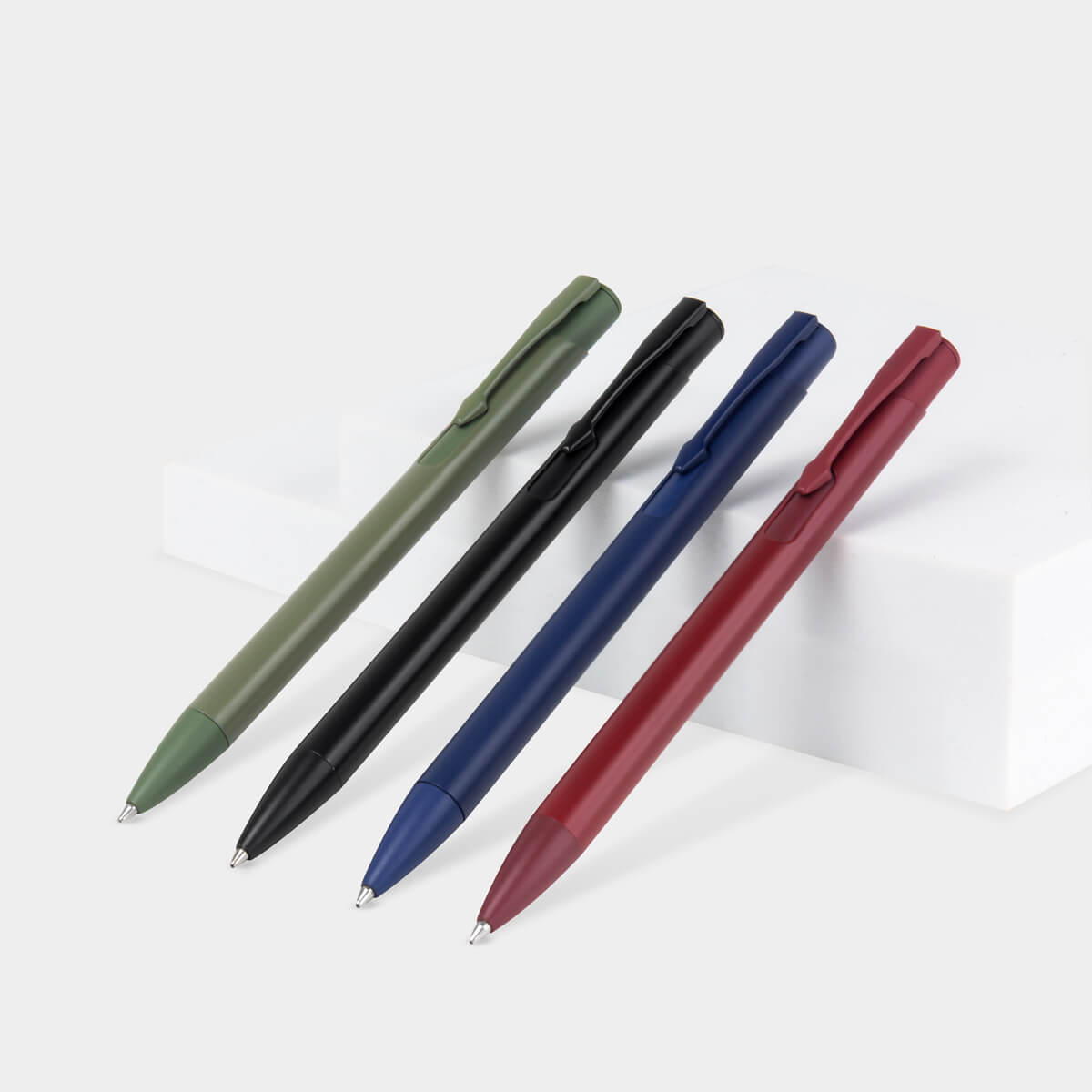 Bolígrafo metálico con acabado mate y clip a color. Mecanismo pulsador.
