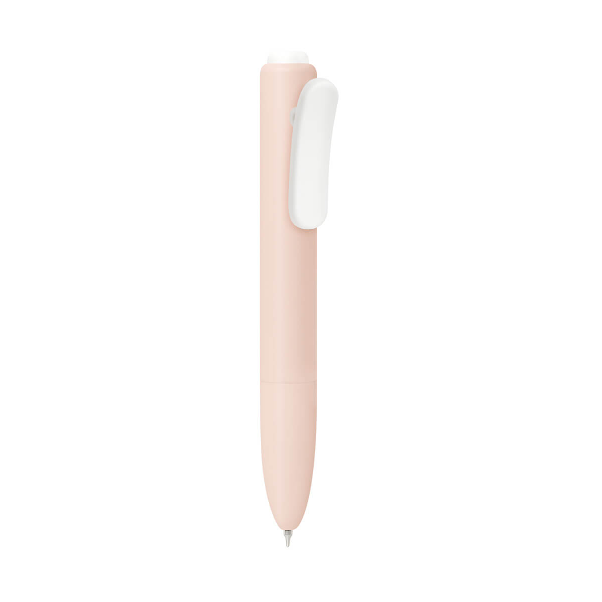 Bolígrafo de plástico con mecanismo pulsador. Su diseño destaca formas suaves y redondeadas. Agrega un clip con función de pinza que aporta un toque moderno y minimalista.