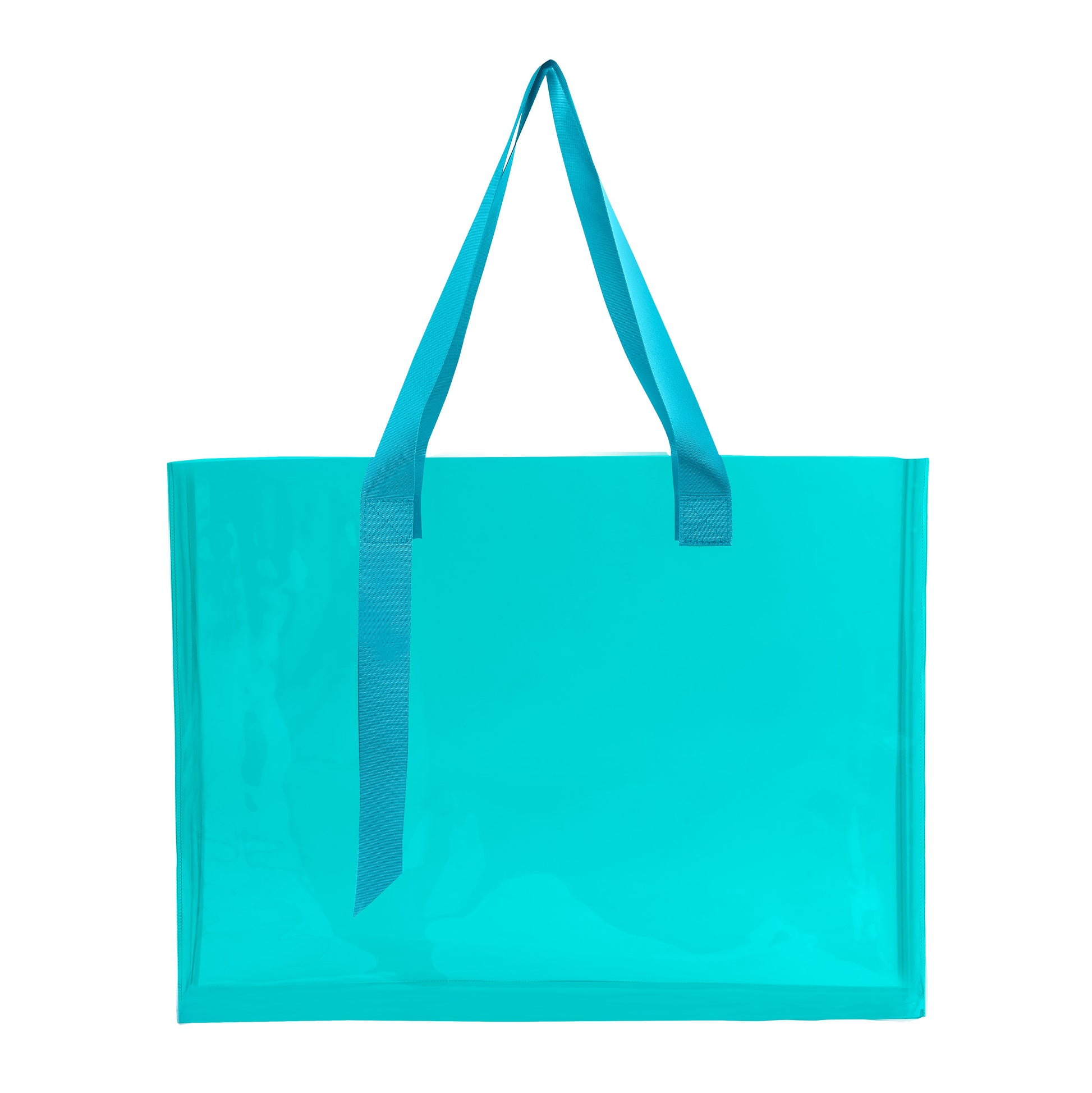 Bolsa con fuelle. Su material de plástico transparente, le da un toque justo de color y estilo. Sus asas de poliéster permite llevarla comodamente al hombro.