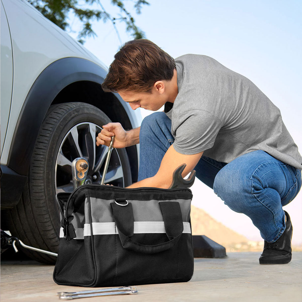 Compartimento principal con cierre y varilla metálica la cual permite mantener la estructura de la bolsa. Su abertura extra ancha permite el fácil acceso a las herramientas. 10 bolsillos internos y 10 externos. Incluye asas de mano y correa ajustable y removible con broche metálico para hombro.
