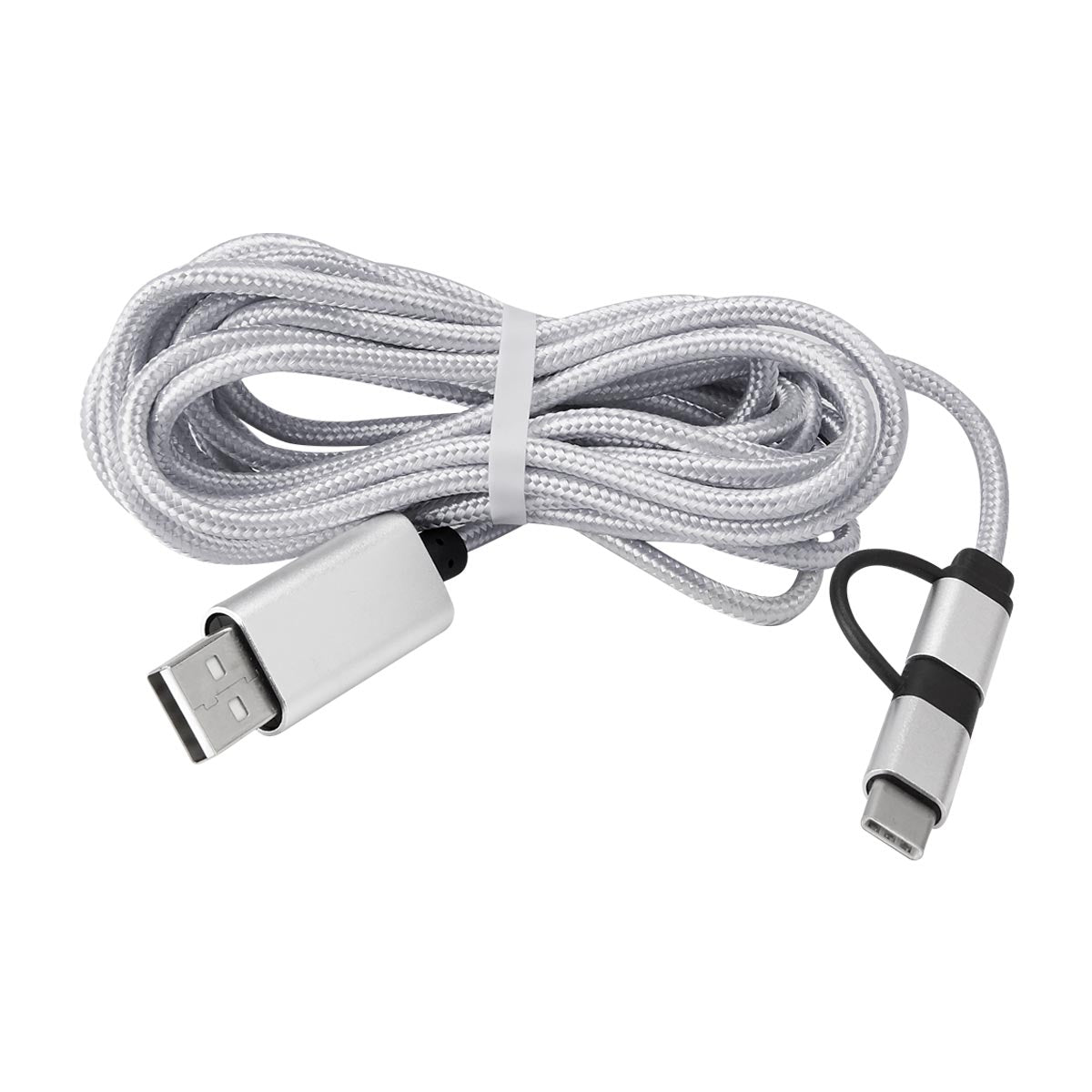 Cable cargador compatible con USB, 8 pin, micro USB y entrada tipo C. Longitud de cable 3m aproximadamente. Incluye estuche translúcido. Este producto por ser últimas piezas puede presentar alguna variación, no se aceptan devoluciones.