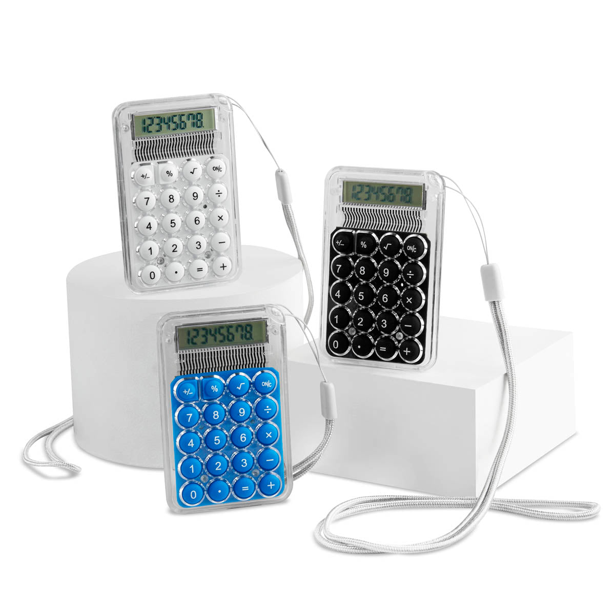 Calculadora de 8 dígitos. Ideal para funciones básicas. Incluye cordón de 40 cm. Batería de botón incluida.