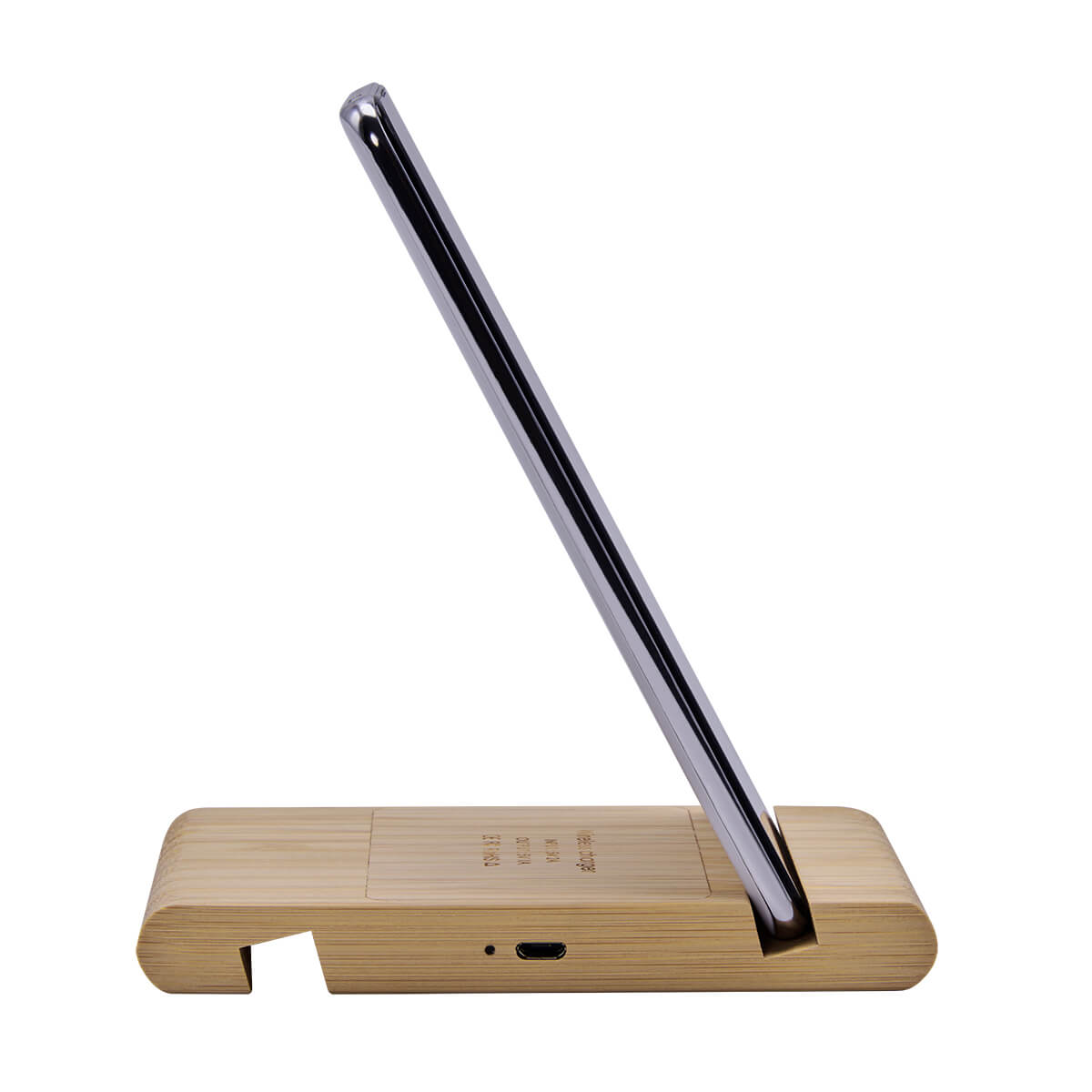 Cargador inalámbrico multifunción con soporte para smartphones y tablets. Incluye LED indicador de carga en proceso y cable con entrada USB y micro USB. Potencia de carga de 5W. Incluye cable cargador. El bambú es un producto natural el cual puede presentar variaciones en tonalidades y vetas.