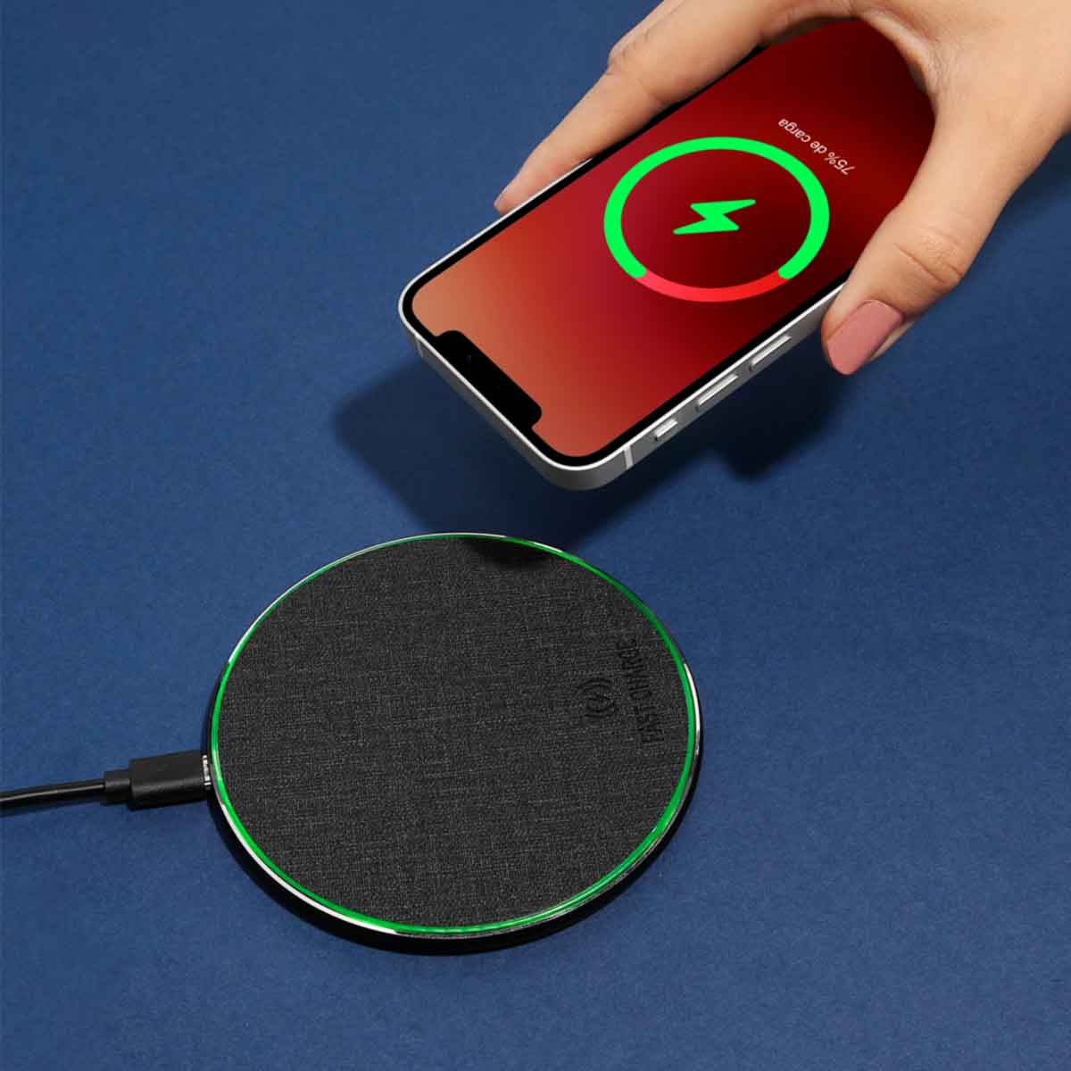 Cargador inalámbrico "fast charge". Velocidad de carga: 5W / 7.5W / 10W / 15W. Se enciende luz color verde cuando está en reposo y luz color azul cuando está en proceso de carga. Incluye cable auxiliar tipo C y caja individual.