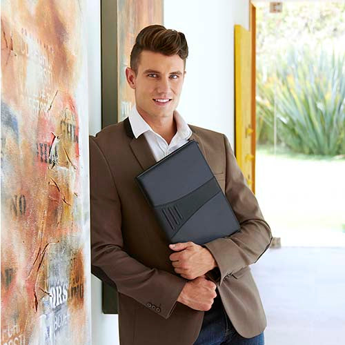 Incluye block de raya tamaño A4 con 20 hojas, elástico para bolígrafo, compartimento para documentos y tarjetas. No incluye bolígrafo.
