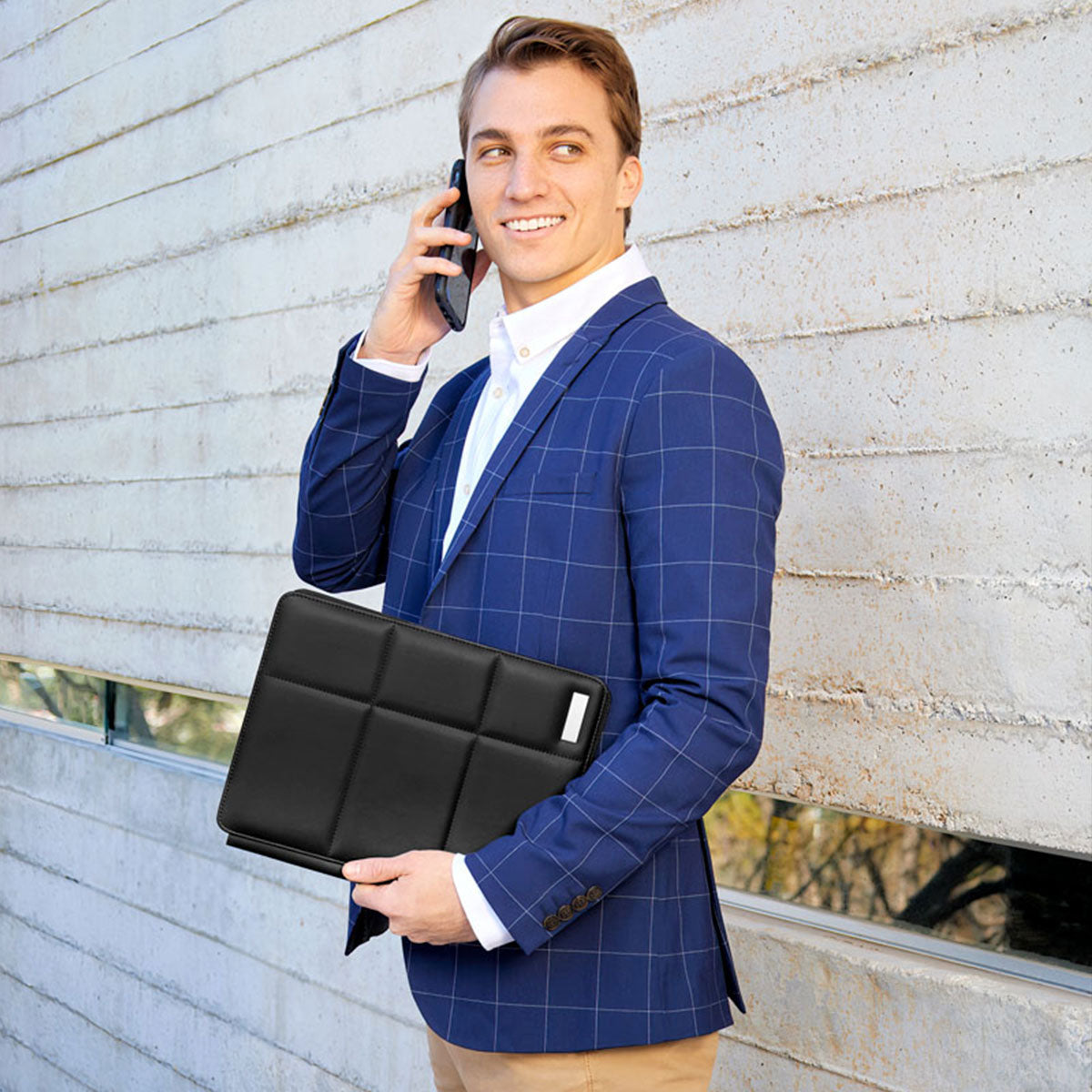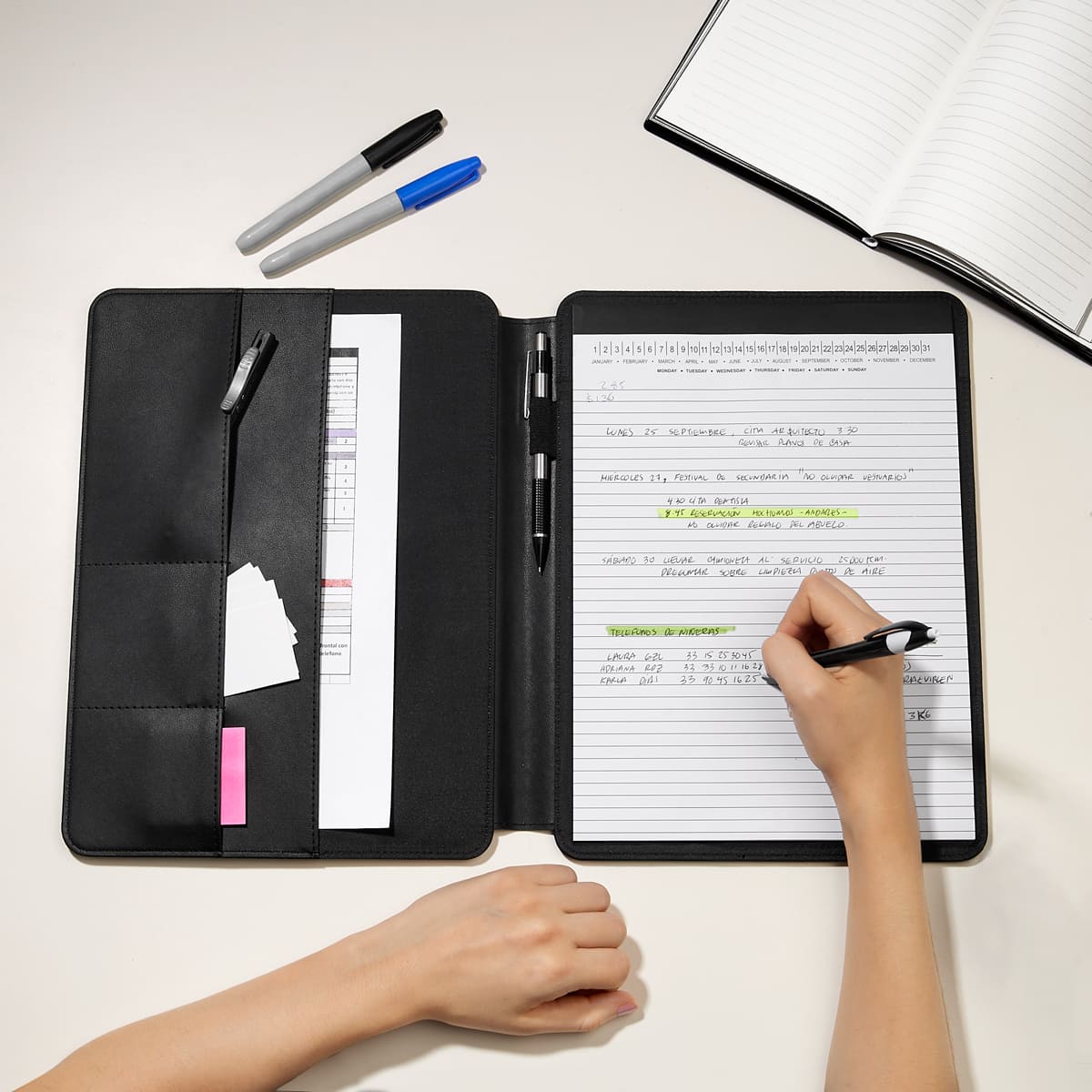 Carpeta de curpiel ideal para organizar y llevar tus documentos importantes. Su portada y contraportada están acolchadas, brindando protección adicional a su contenido. Cuenta con una placa metálica en la portada que añade un toque de sofisticación. Al interior permite guardar bolígrafos, hojas sueltas, tarjetas de presentación y otros accesorios esenciales. Incluye un bloc de notas de 20 hojas.