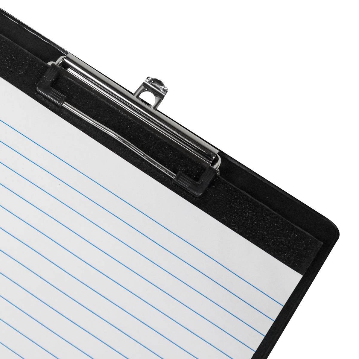 Carpeta de plástico con clip metálico. Incluye bloc de notas con 20 hojas. Cuenta con compartimento plegable para sostener un bolígrafo. Cuenta con una pequeña solapa interna para colocar hojas adicionales o tarjetas de manera ordenada y accesible.