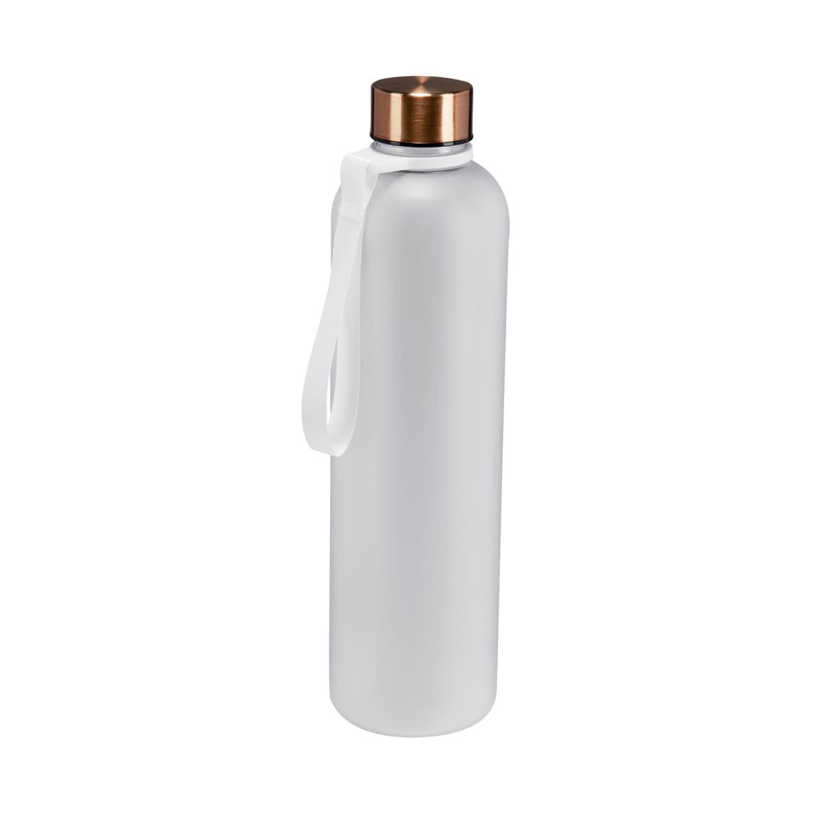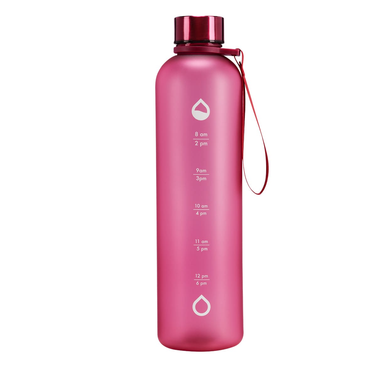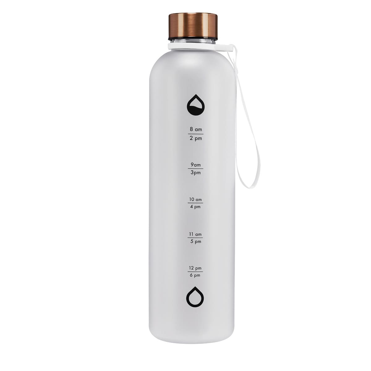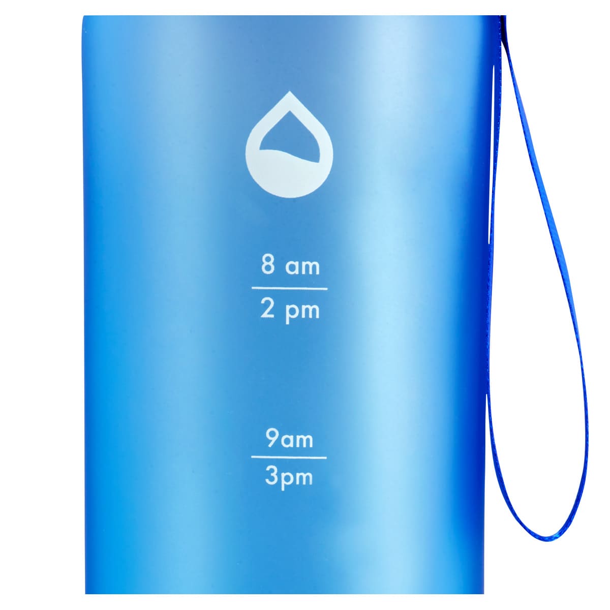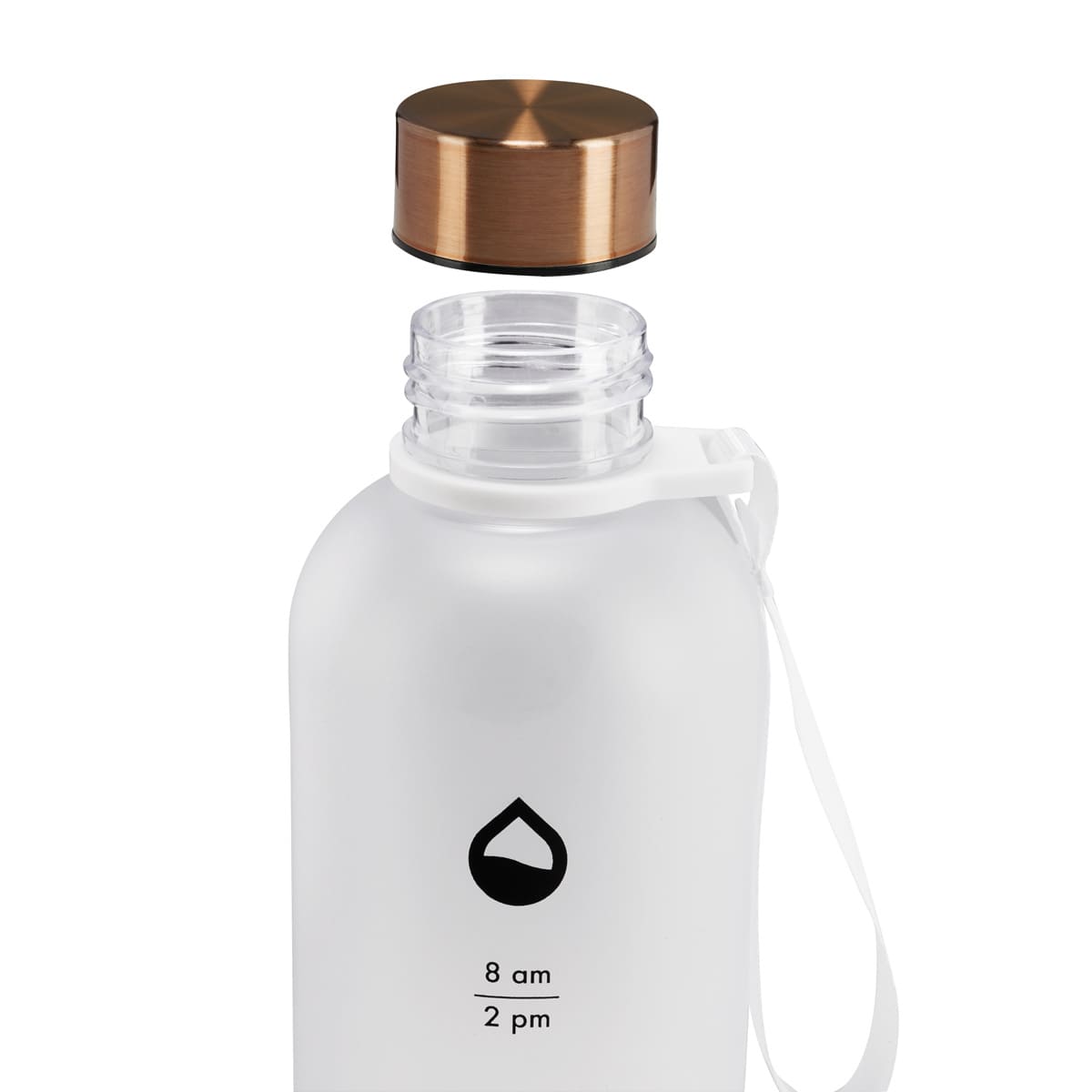 Tapa metálica con cierre de rosca. Aro de plástico con asa de tela. Cuerpo con terminado mate, suave al tacto y color frosty . Incluye marcador de tiempo para motivar tus hábitos de hidratación. Incluye caja individual.