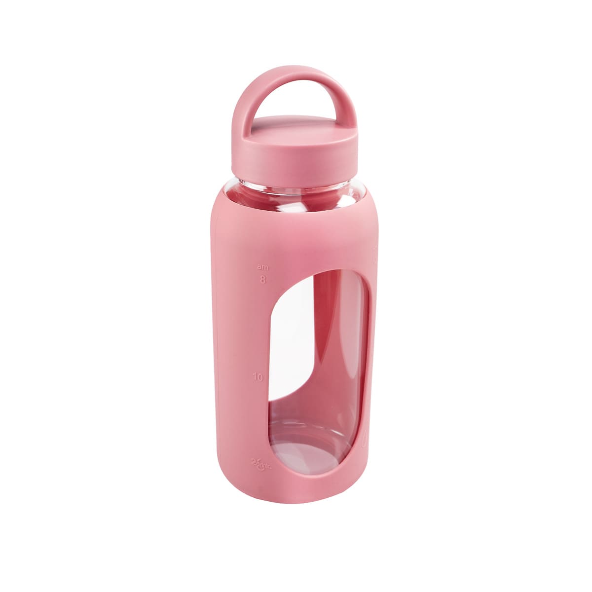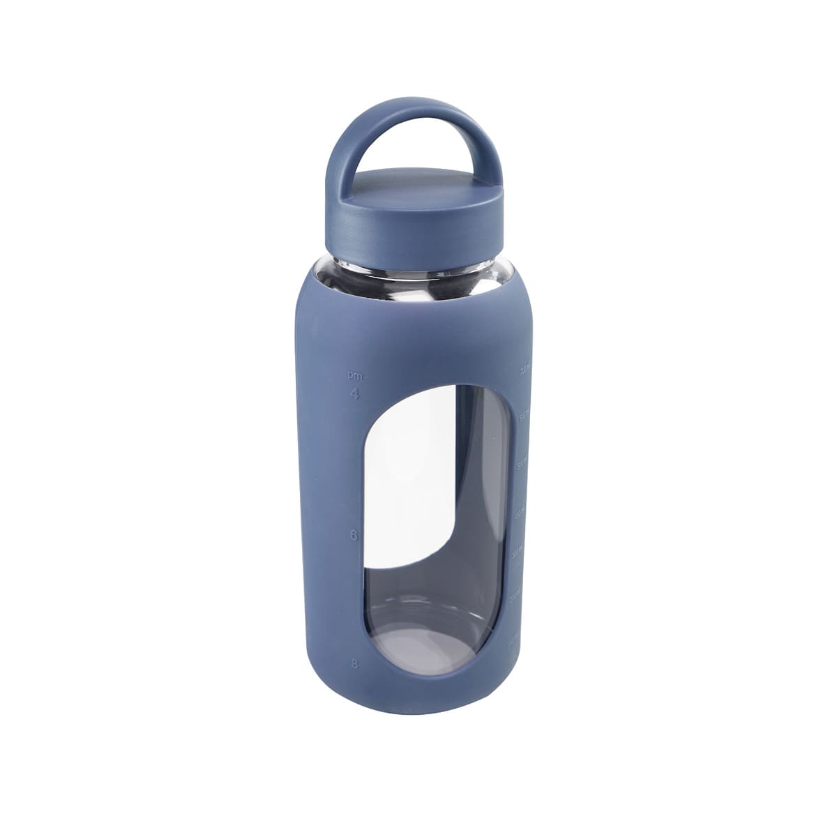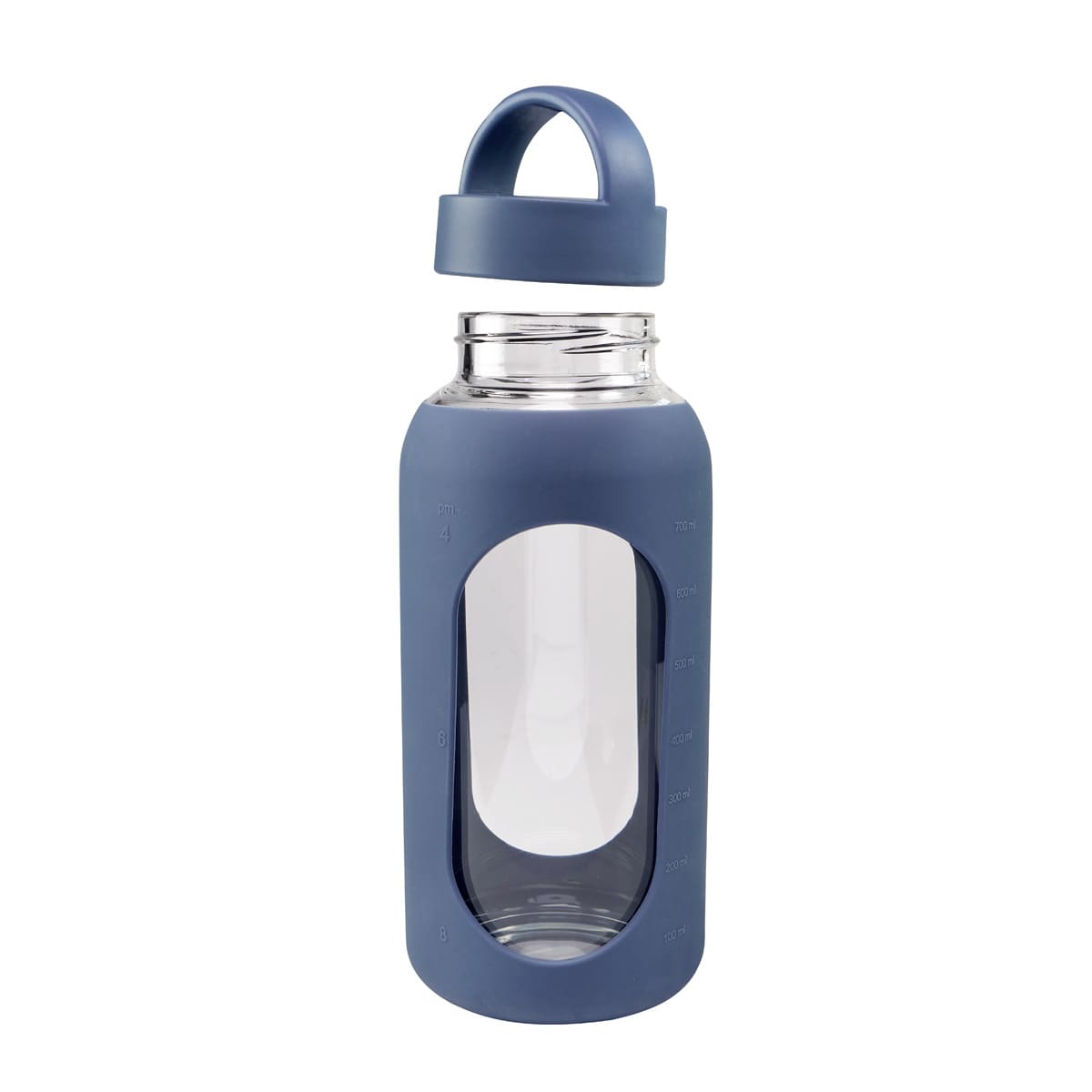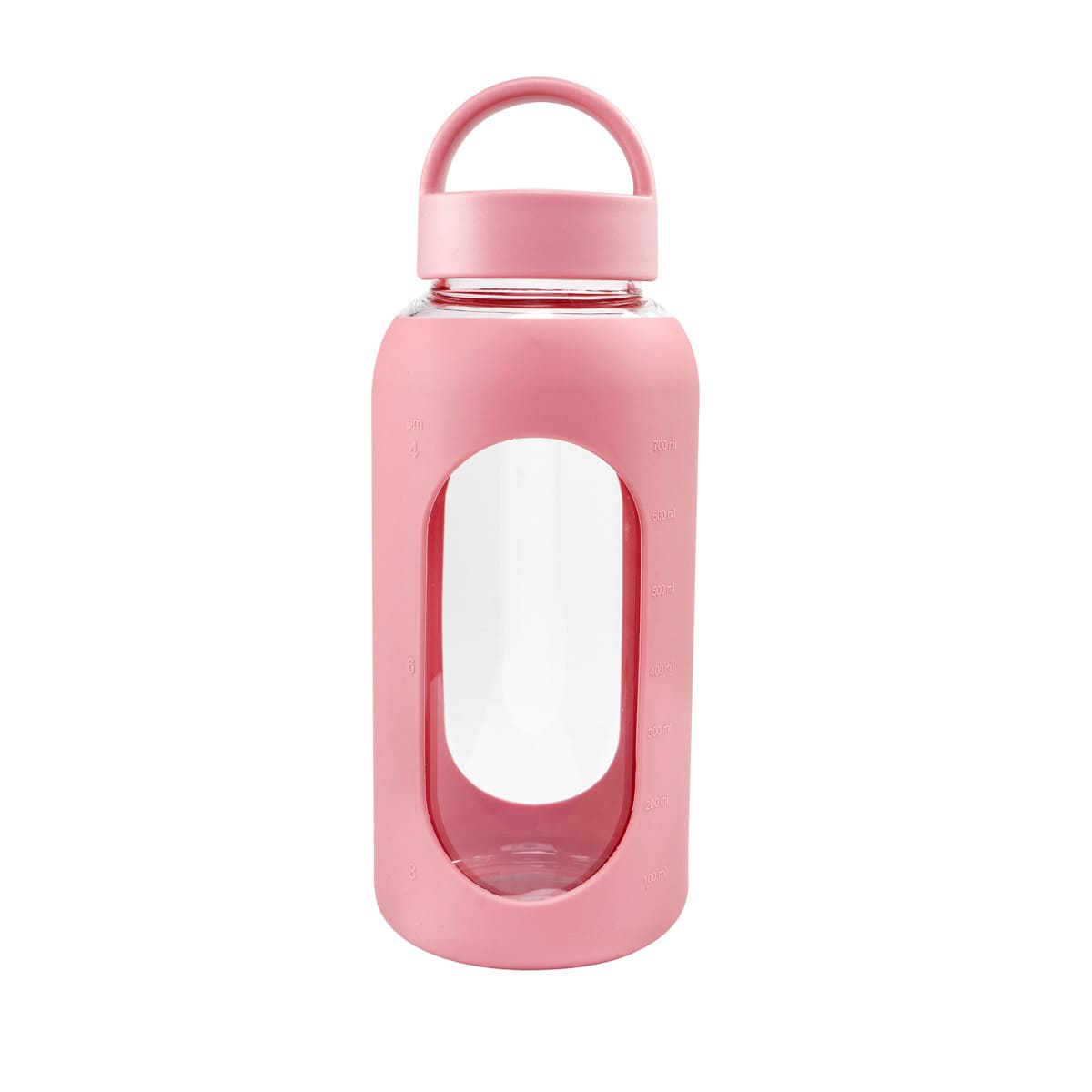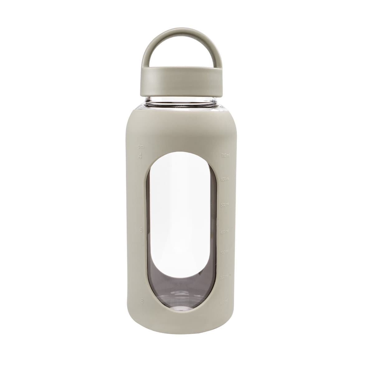 Cilindro de vidrio con manga de silicón graduada en ml. Tapa de plástico con sistema de rosca y asa. Vidrio resistente a bebidas calientes y frías. Incluye caja individual.