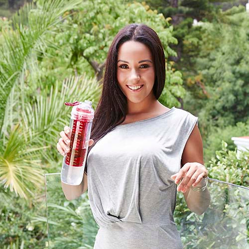 Cilindro con infusionador para frutas o bolsas de té. Tapa con sistema de rosca boquilla y sobre tapa que cierra a presión. Incluye caja individual.