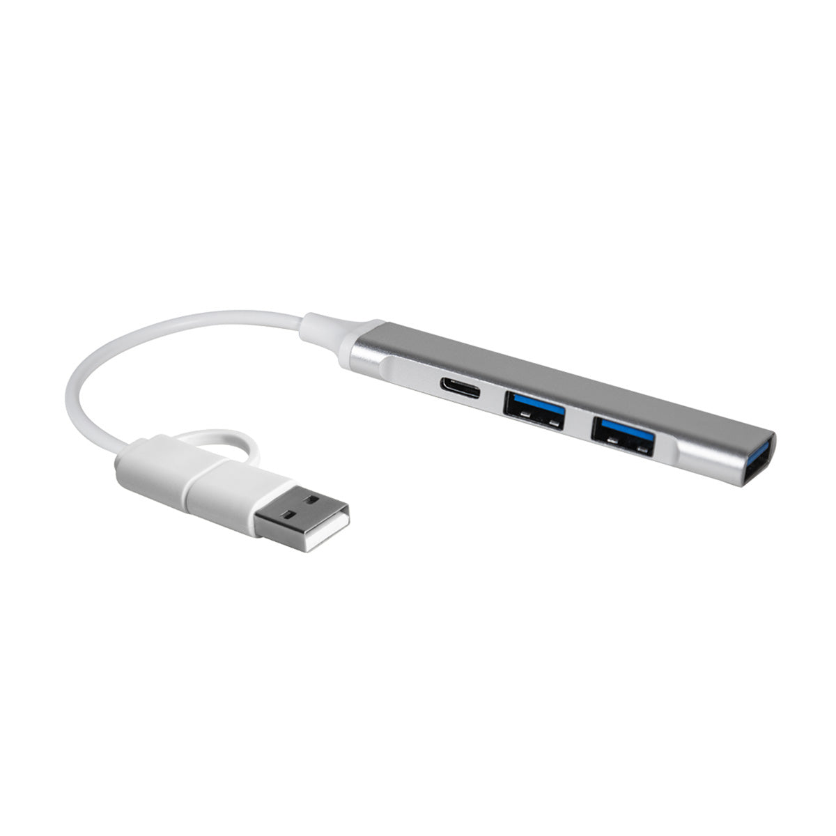 Concentrador acabado metálico con 3 puertos USB y 1 puerto tipo C. Soporta transferencia de datos. Cable de conexión con USB y tipo C.