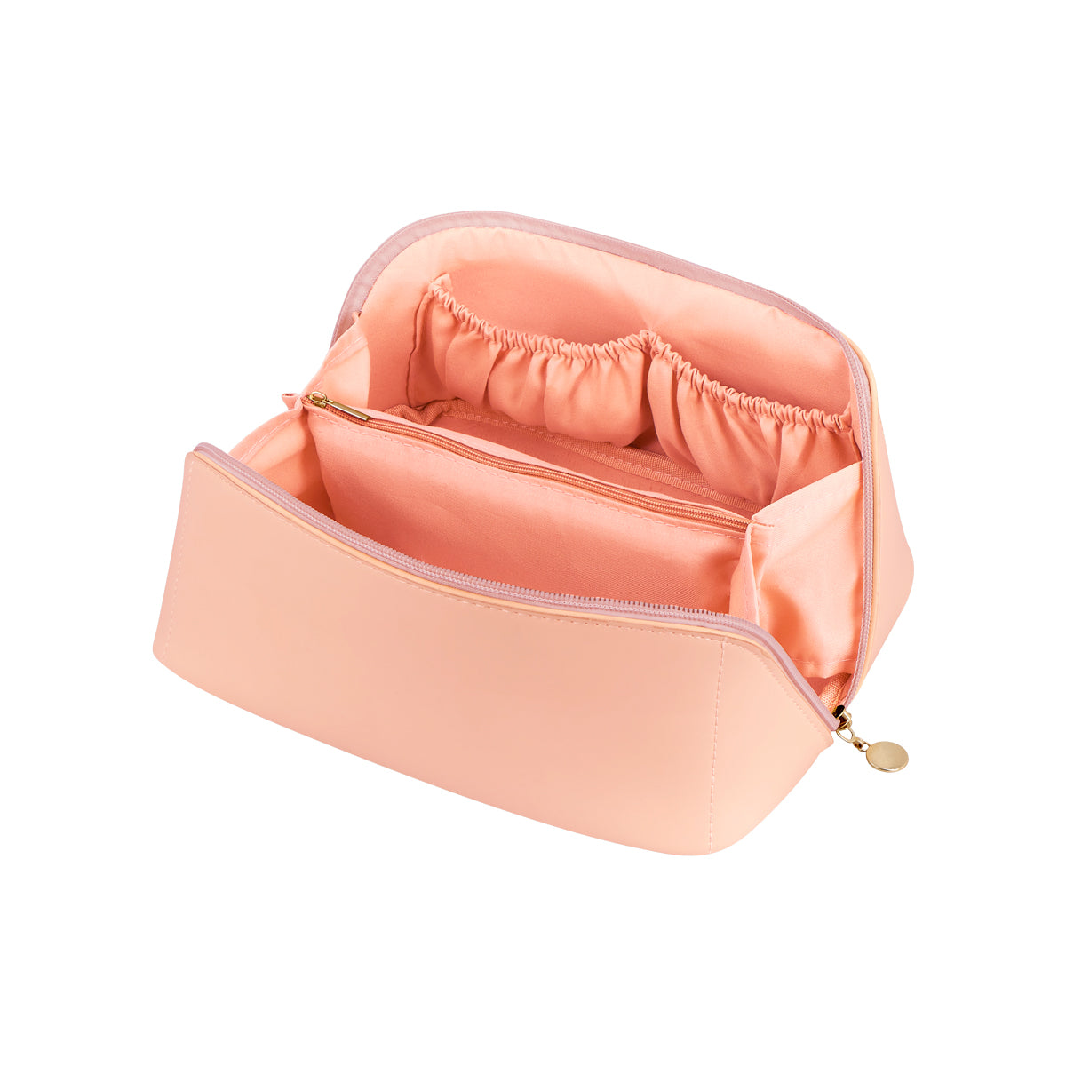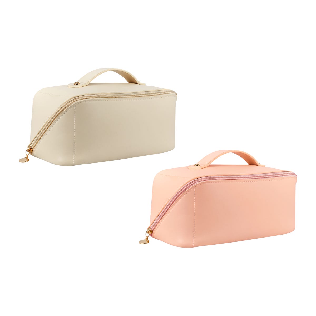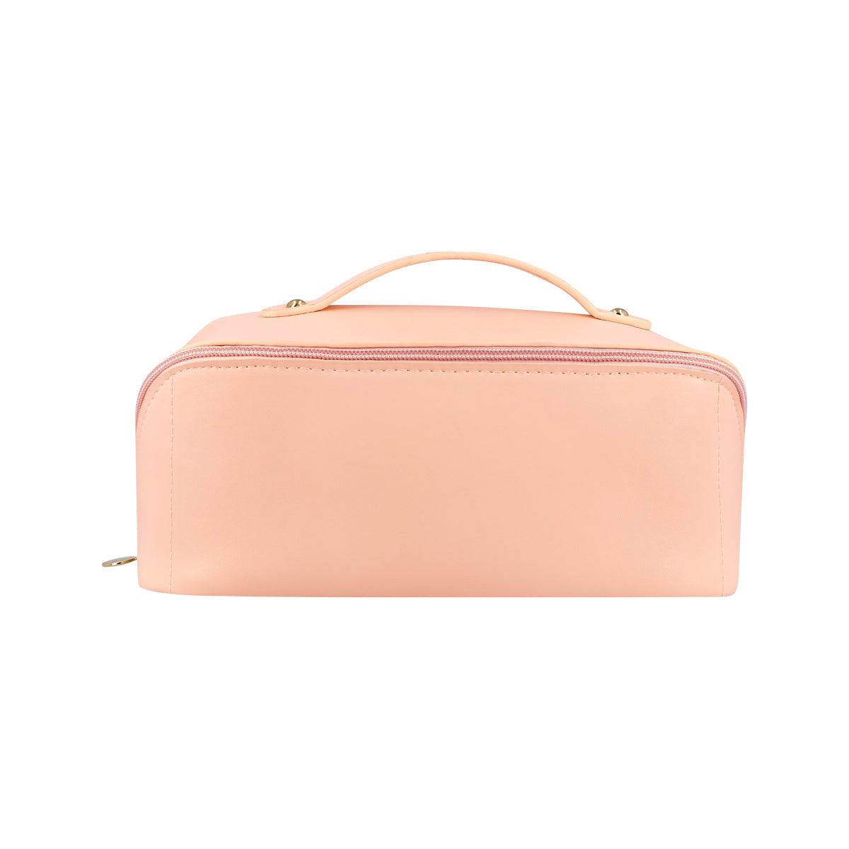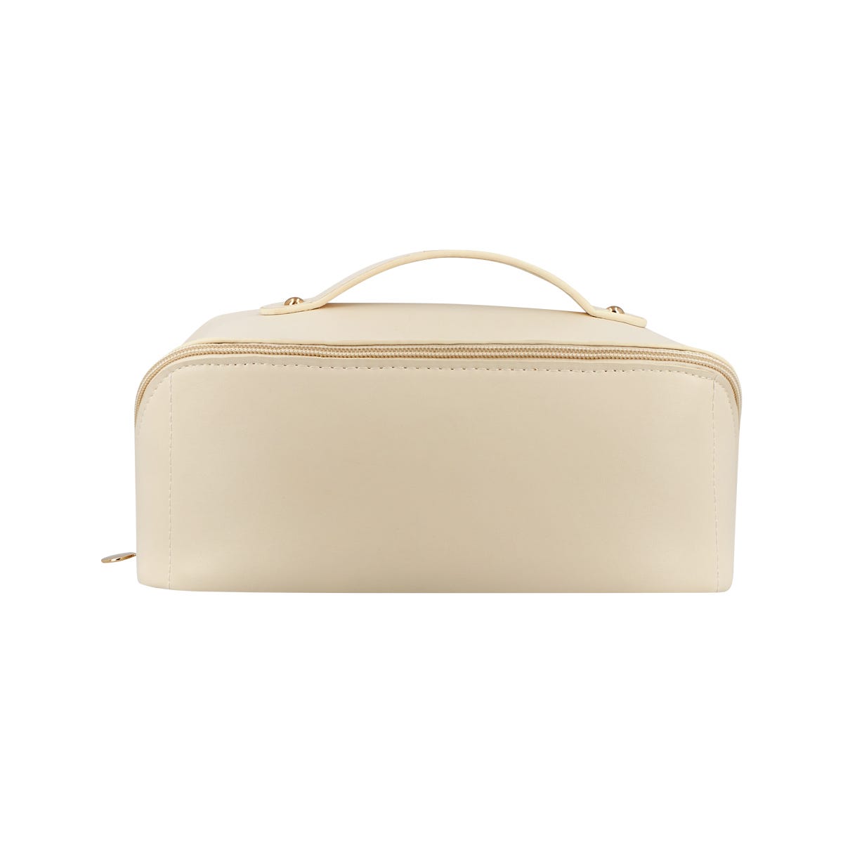 Su elegante diseño en curpiel agrega un toque de sofisticación a tu rutina diaria, su cierre cruzado permite expandir la cosmetiquera al abrir, brindándote un fácil acceso a tus productos. En su interior, encontrarás tres elásticos organizadores que mantienen tus artículos en su lugar, evitando que se mezclen. Además, cuenta con un bolsillo central con cierre, ideal para guardar objetos más pequeños. Incluye un asa del mismo material, lo que facilita su transporte. Podrás llevar tus productos esenciales de belleza de manera ordenada, ya sea en casa o en tus viajes.