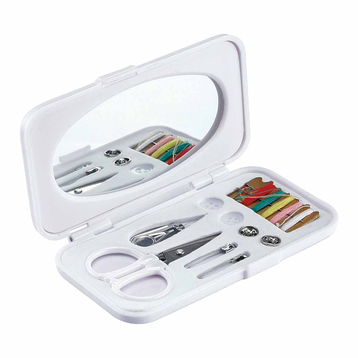 Incluye botones, ensartador de aguja, tijeras, hilo, agujas, seguros y estuche con espejo. Este producto por ser últimas piezas puede presentar alguna variación, no se aceptan devoluciones.