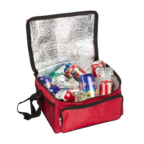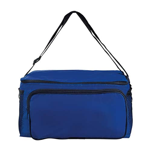 Interior metalizado plastificado e impermeable. Bolsa principal y frontal con cierre. Bolsas laterales de red. Incluye correa ajustable. Capacidad para 12 latas.