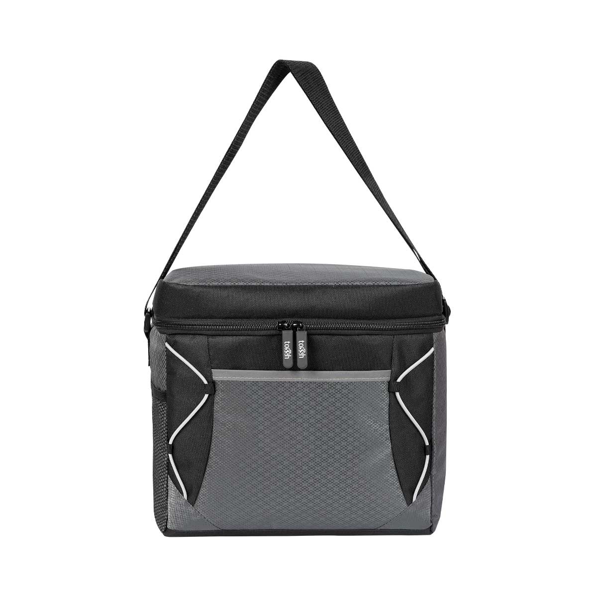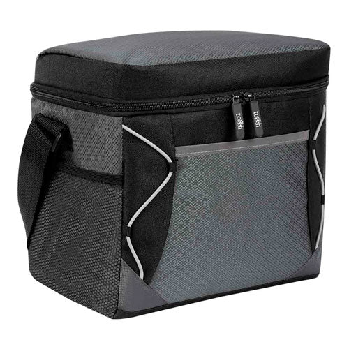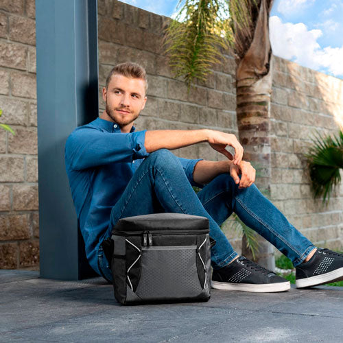 Interior plastificado impermeable. Bolsa principal con cierre. Bolsa lateral de red y bolsillo frontal. Incluye correa ajustable. Capacidad para 10 latas.