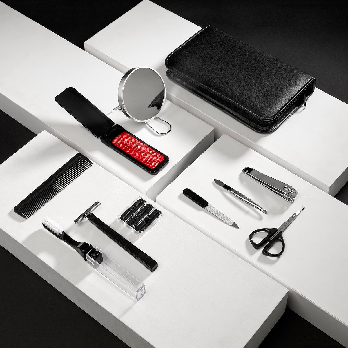 Set de cuidado personal. Ideal para tus viajes, mantente impecable en cualquier momento. Incluye los siguientes 10 accesorios: espejo, lima, cortaúñas, pinzas, tijeras, peine, cepillo dental, rastrillo con 3 navajas de repuesto y un calzador plegable con limpiador de calzado.