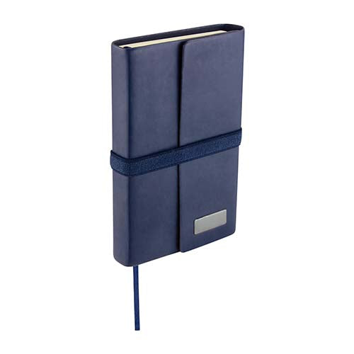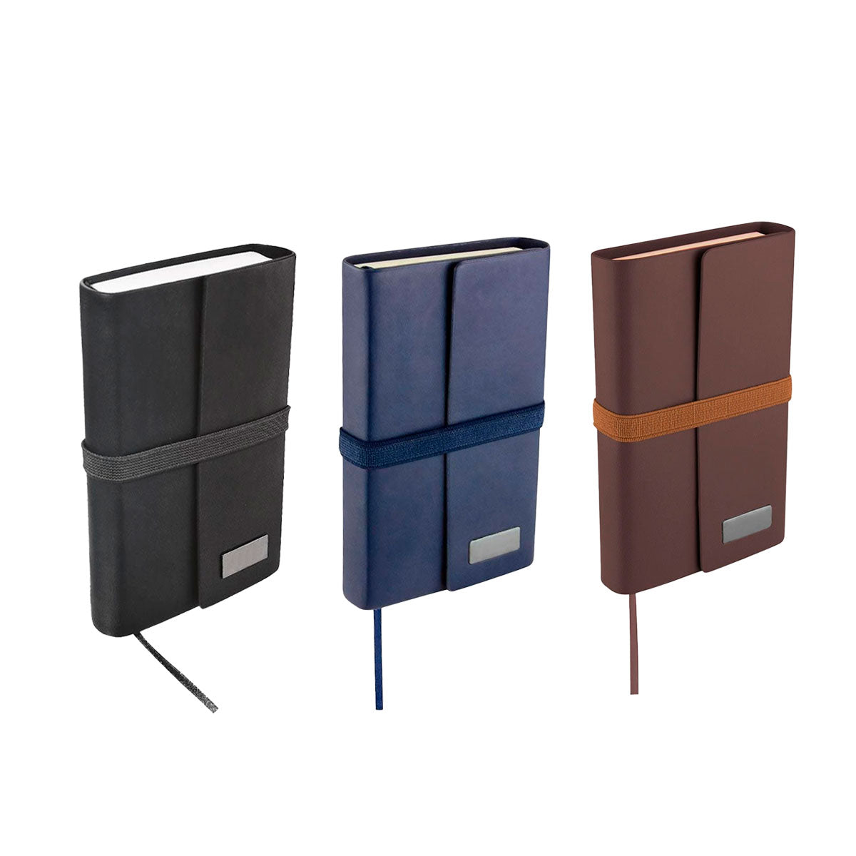 Libreta con 120 hojas de raya. Incluye separador de hojas, elastico para cerrar y placa para grabado.
