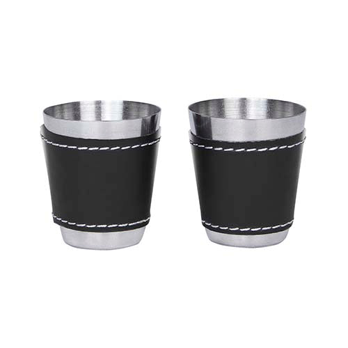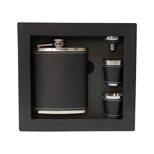 Set de licorera con tapa de rosca para evitar derrames, 2 vasos metálicos con manga de curpiel, 1 embudo y caja de regalo.