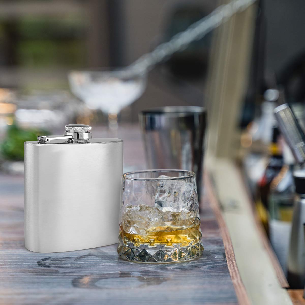Licorera de bolsillo, discreta y ligera con tapa de rosca para evitar derrames.