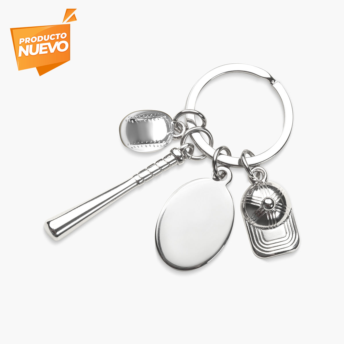 Llavero metálico con placa para grabado. Incluye 3 dijes con diseño de: bate, pelota y gorra. Este llavero es ideal para los apasionados del béisbol. Incluye caja individual.
