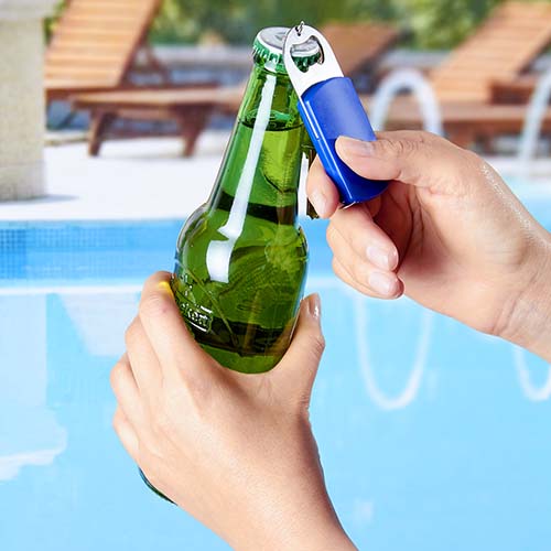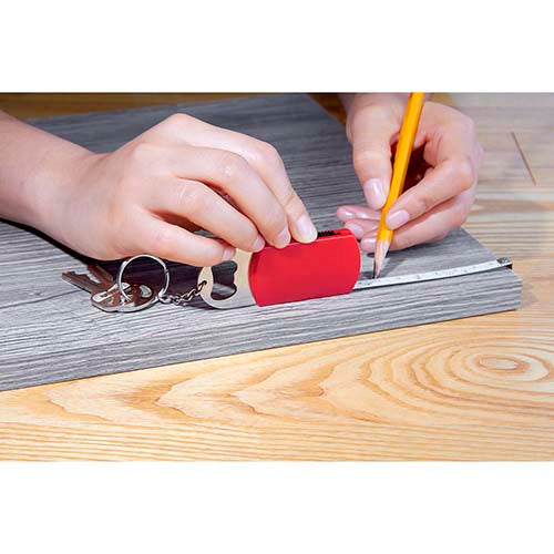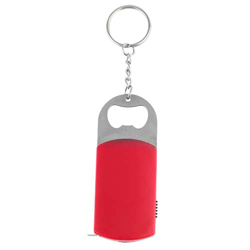 Llavero destapador con lámpara de 1 LED y flexómetro de cinta metálica de 1 m.