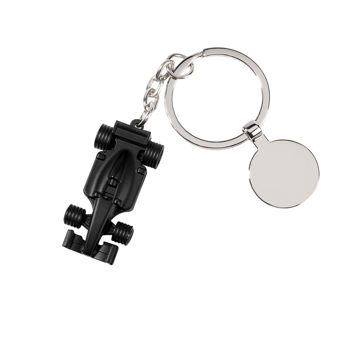 Llavero metálico con diseño de auto de carreras. Incluye placa metálica circular para grabado y caja individual.