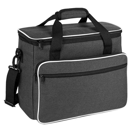 Interior plastificado. Bolsa principal y bolsas frontales con cierre. Asas con agarre de velcro y correa ajustable. Capacidad para 20 latas.