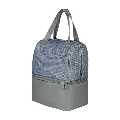 Interior plastificado. Compartimento superior e inferior con cierre y bolsillo frontal. Cuenta con 2 asas de agarre superior. Capacidad para 12 latas.