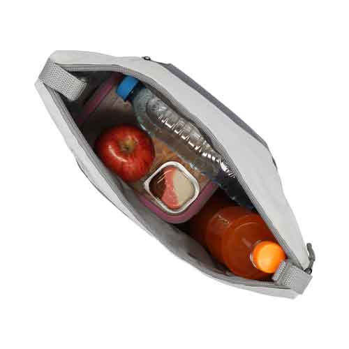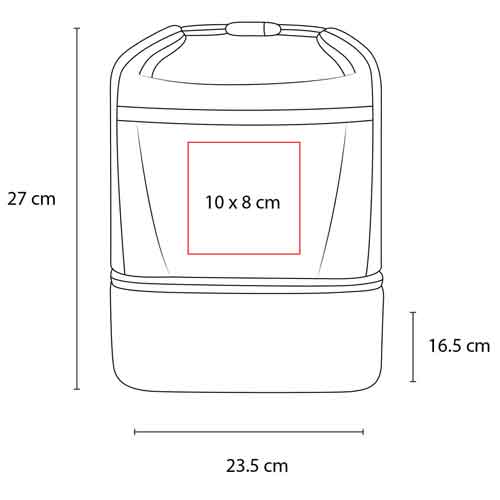 Interior plastificado. Doble compartimento con cierre. Bolsillo frontal. Agarradera con broche de plástico. Capacidad para 9 latas.