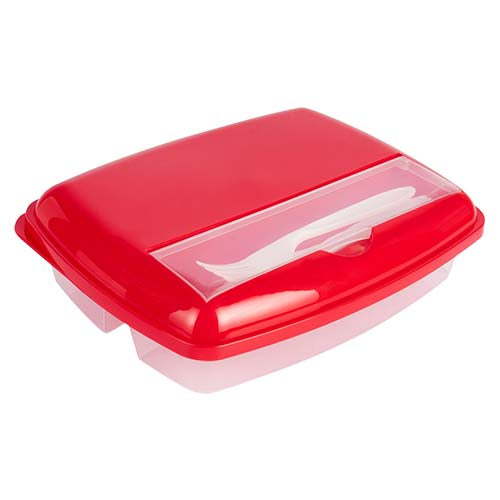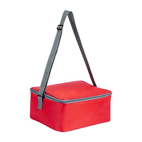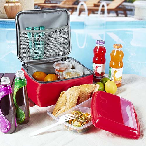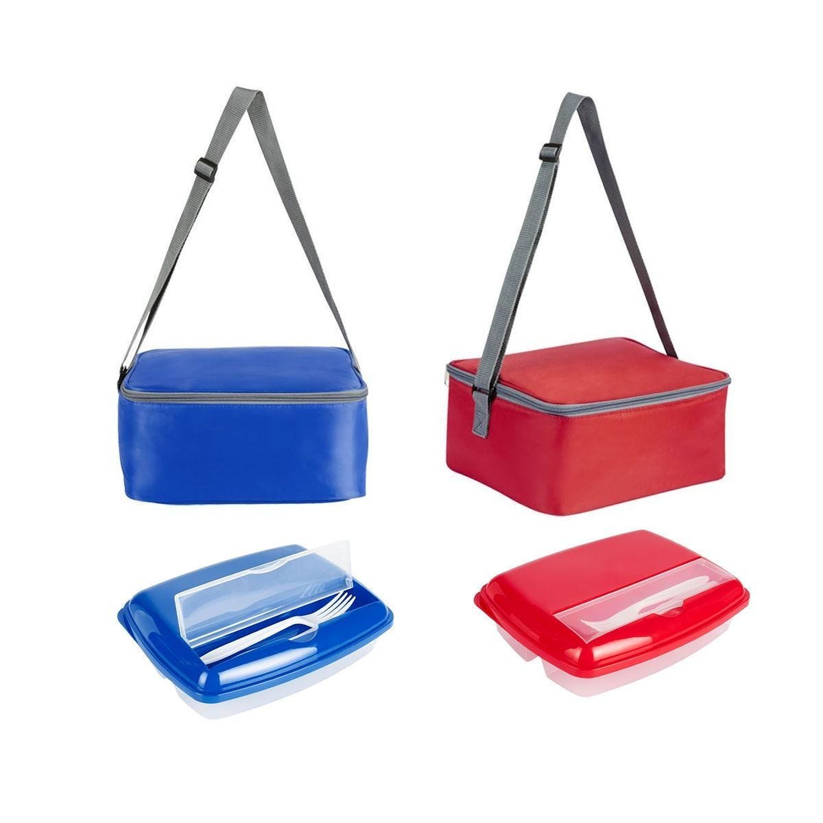 Set de lonchera y contenedor de plástico. Lonchera con interior plastificado, bolsa principal con cierre, bolsa de red en el interior de la tapa y correa ajustable. Contenedor de plástico con compartimento para tenedor y cuchillo.