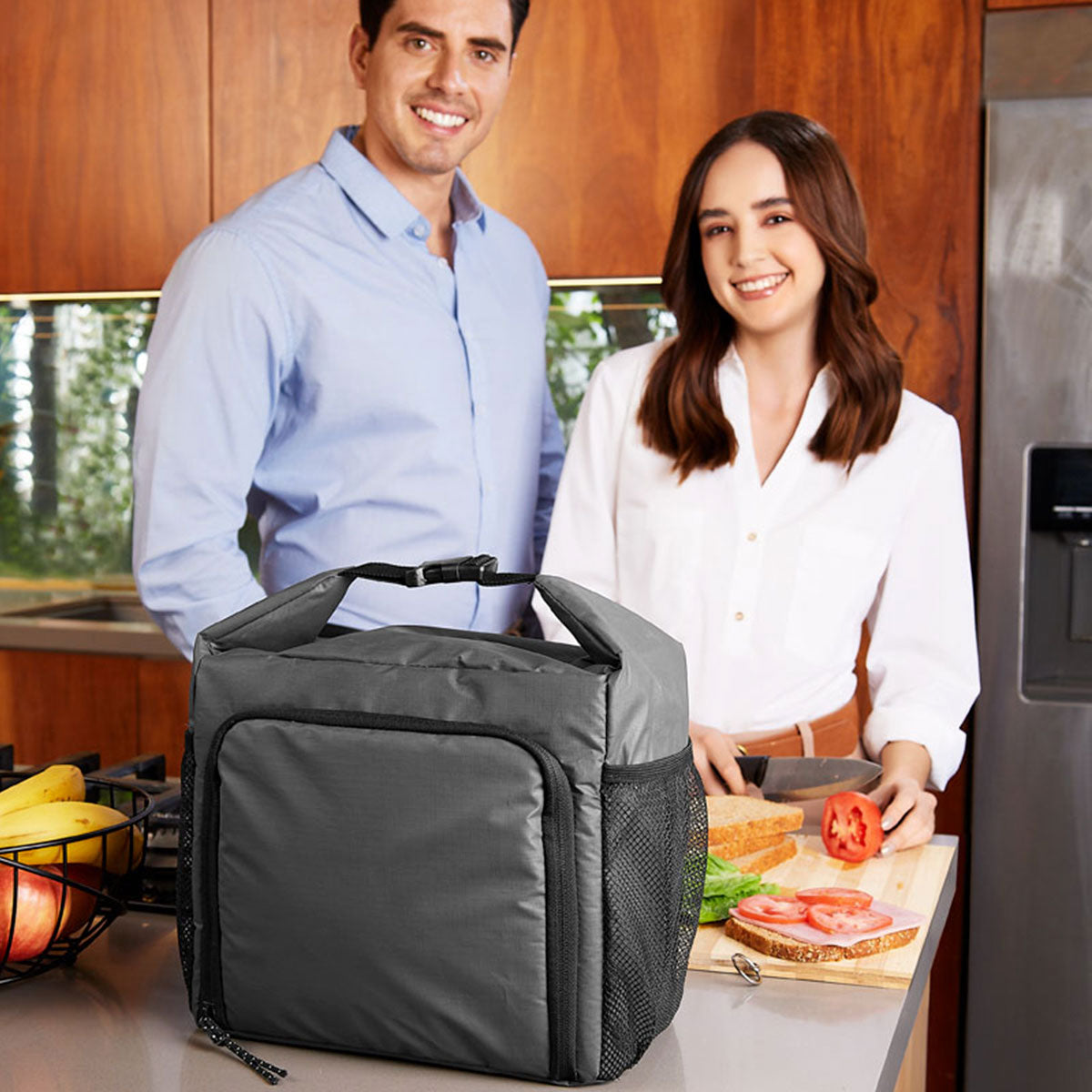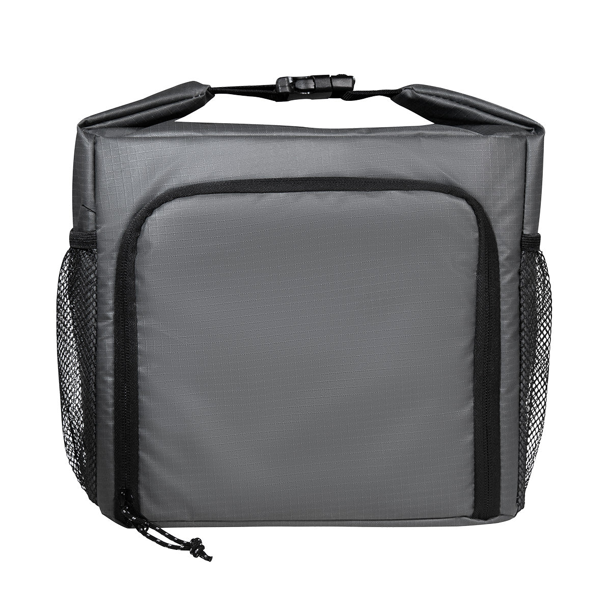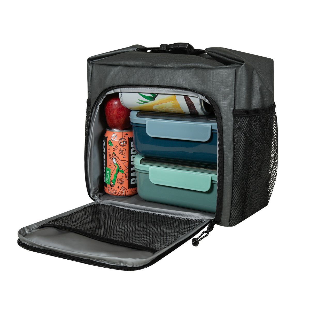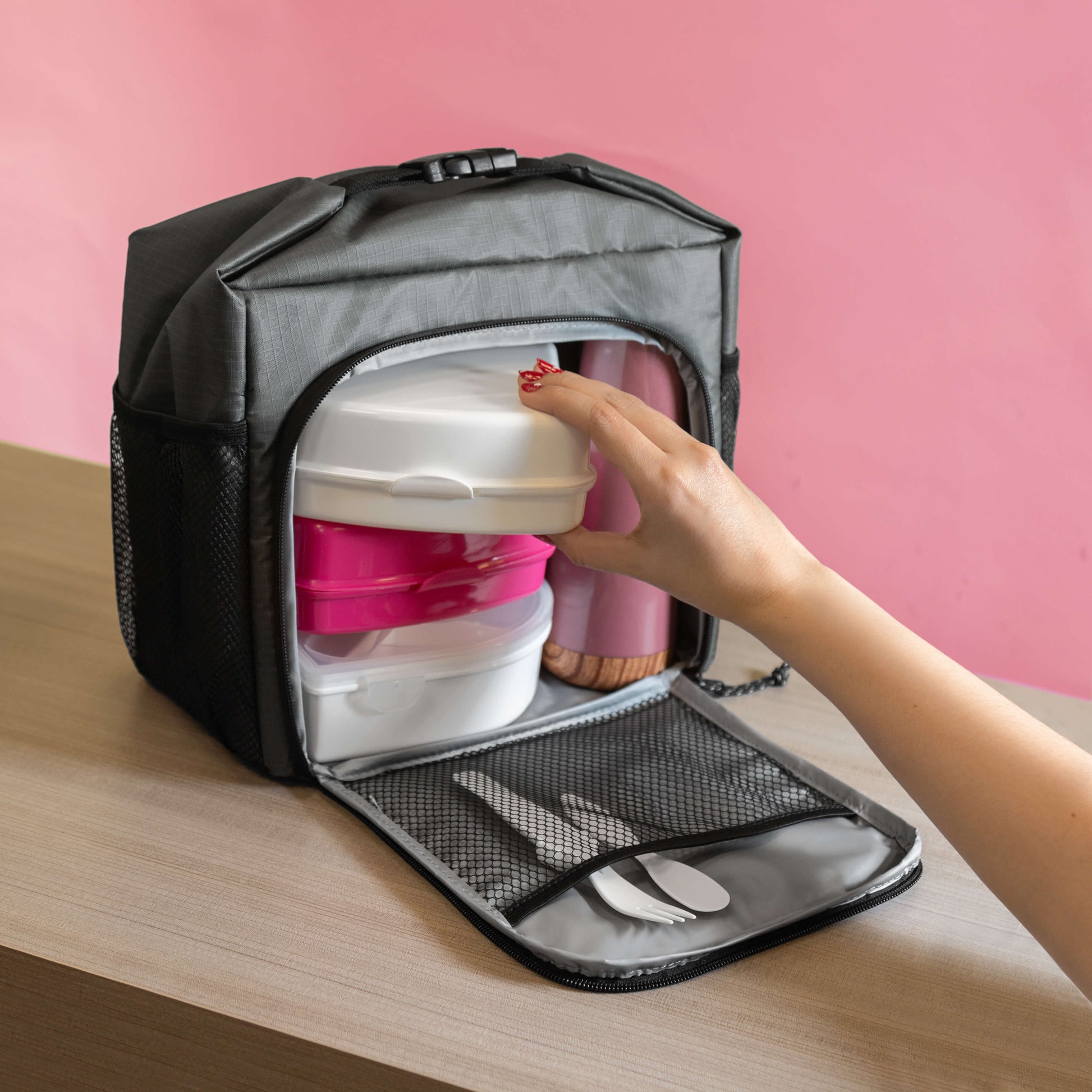 Lonchera con interior plastificado. Cuenta con bolsillo principal frontal con cierre para almacenar alimentos de forma segura. En ambos laterales, cuenta con un bolsillo de malla, ideal para botellas de agua u otros artículos de acceso rápido. En la parte superior, integra un asa con broche de plástico que facilita su portabilidad. Capacidad para 12 latas.