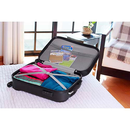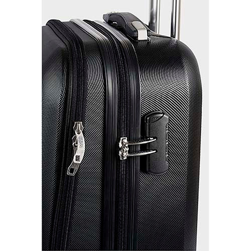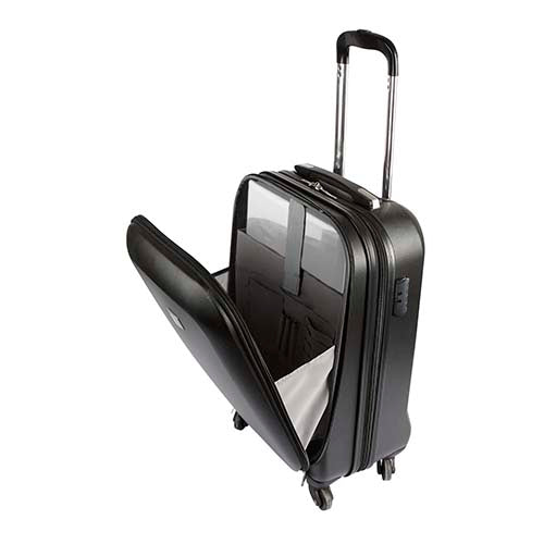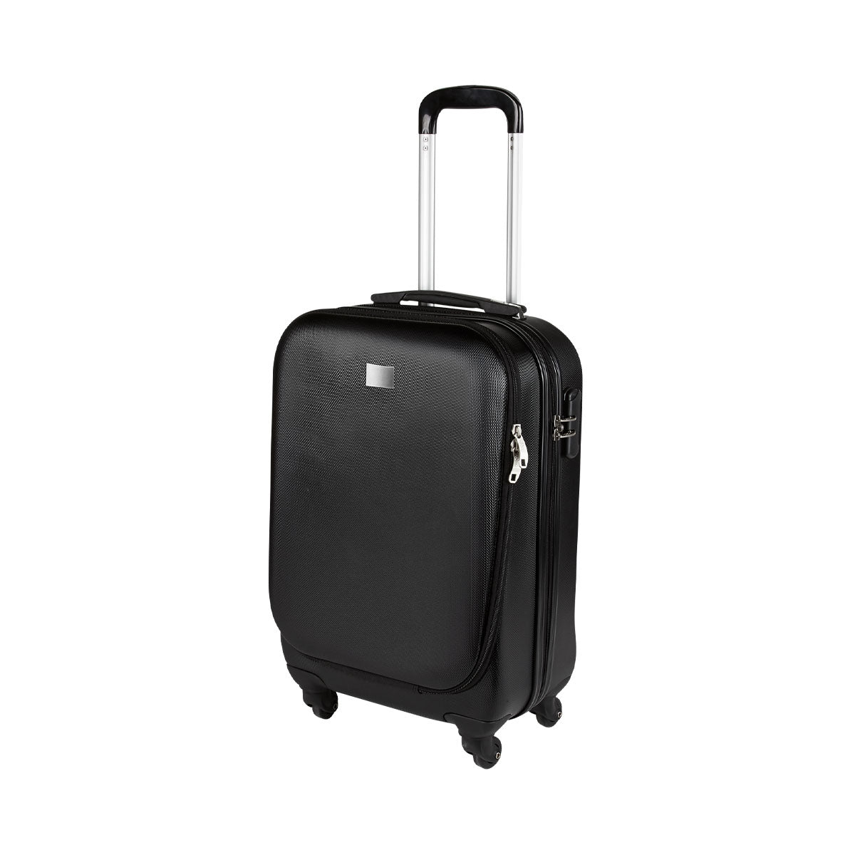 Maleta trolley con 4 ruedas. Cierre frontal con espacio para laptop y organizador de documentos. Cierre principal con 2 compartimentos internos. Placa metálica removible para fácil grabado y candado de seguridad con combinación de 3 dígitos. Asa de agarre superior.