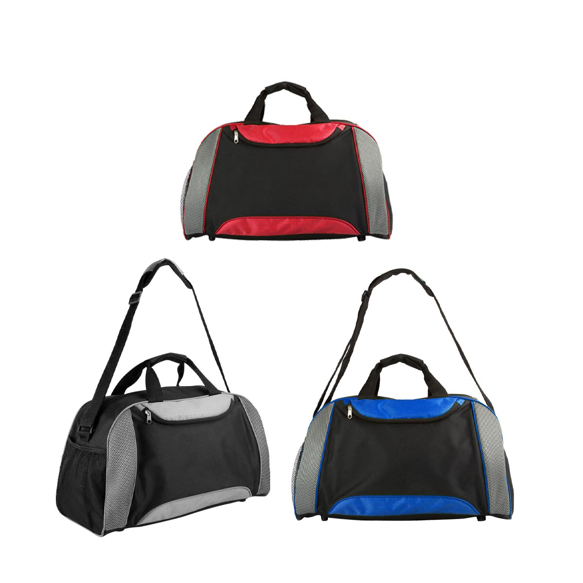 Bolsa principal con cierre, zapatera posterior con cierre, bolsa lateral de red, asas y correa para hombro ajustable.