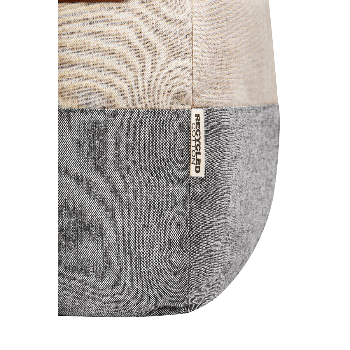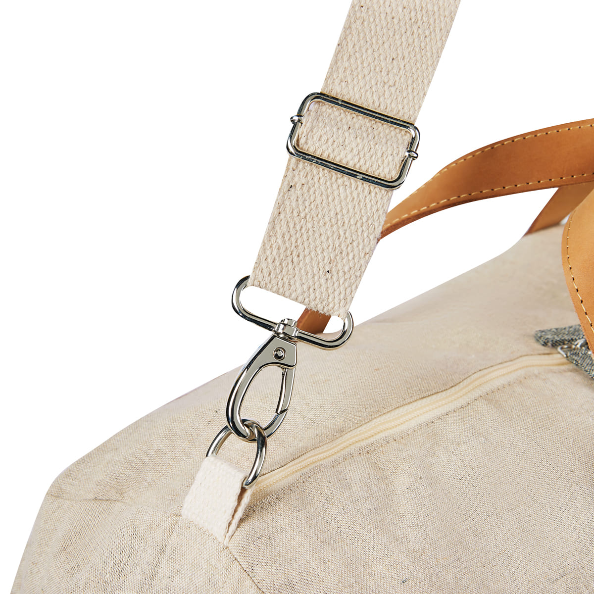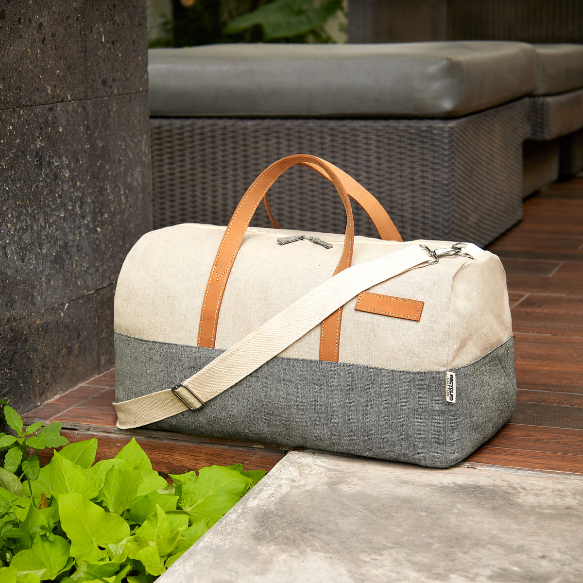 Maleta que destaca tanto en diseño como en estilo. Es ligera y ecológica, hecha de algodón reciclado. Compartimento principal con cierre y base de cartón removible. Incluye asa ajustable removible para hombro.