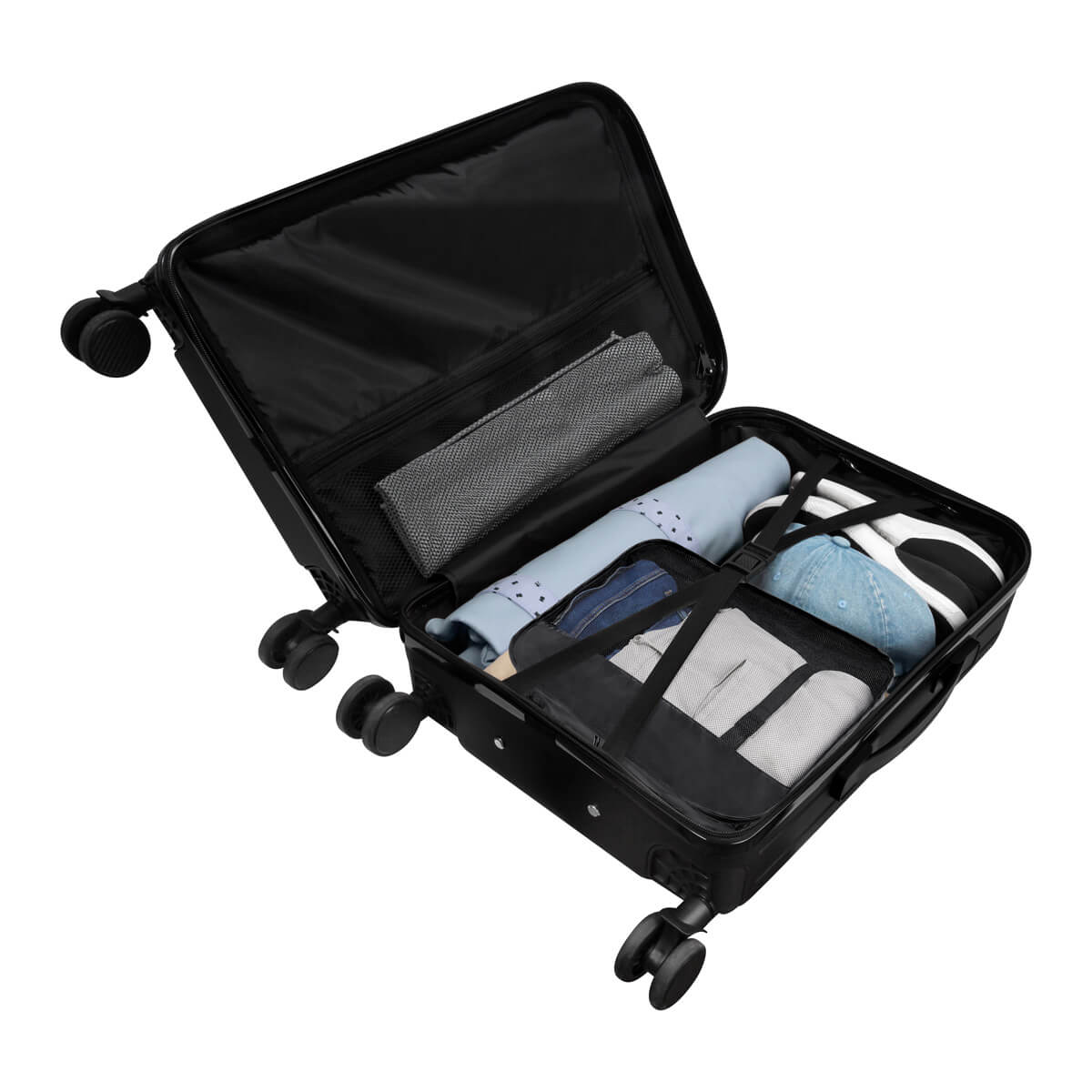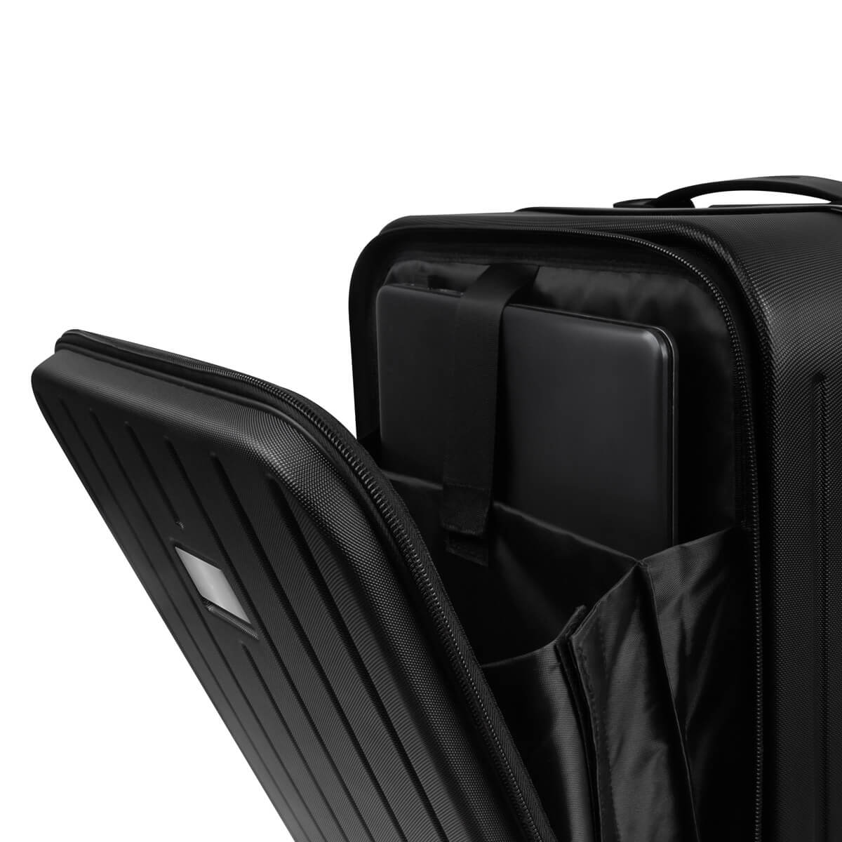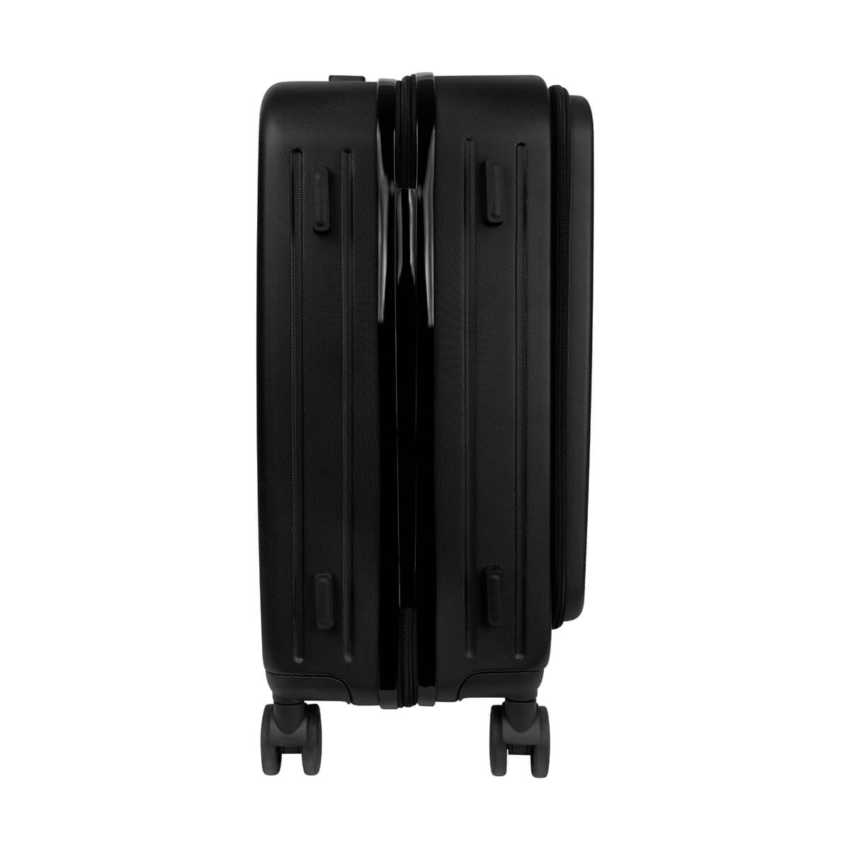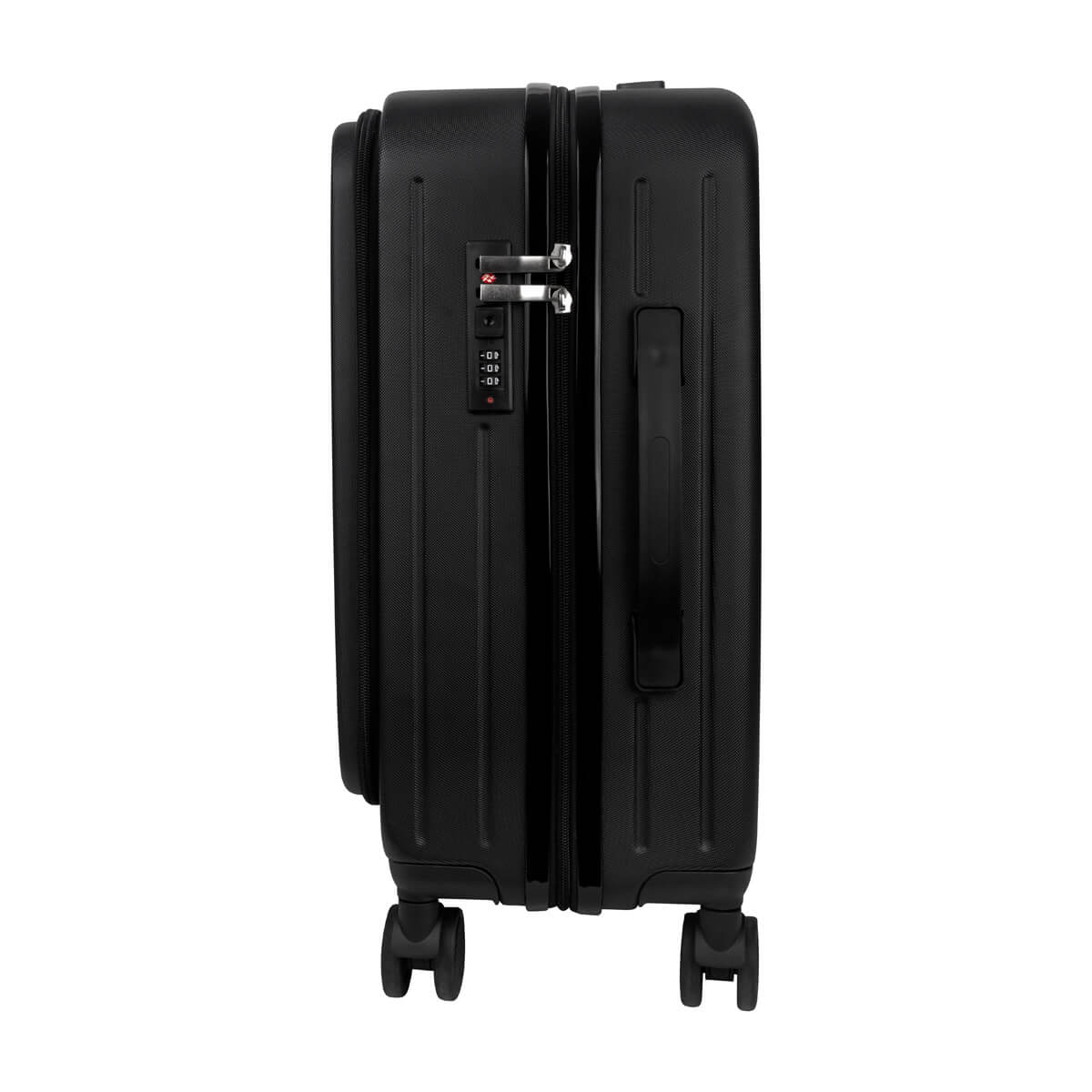 Maleta carry-on con dimensiones aprobadas para cabina. Ideal para viajes cortos o de negocios. Compartimento frontal para lap top que permite un fácil acceso, sin necesidad de abrir toda la maleta. Su innovador diseño, Incluye un porta bebidas plegable en la parte trasera y un práctico gancho portabolsas en la parte lateral, ideal para las compras de último momento. Cuenta también con un soporte para smartphone integrado en el asa del trolley, para un práctico manejo de dispositivos portátiles. Incluye candado de combinación para mayor seguridad. Cuenta con cuatro ruedas de giro suave y asa trolley retráctil con dos niveles ajustables, que facilitan su adecuada movilización.
