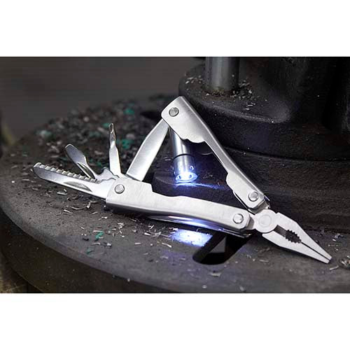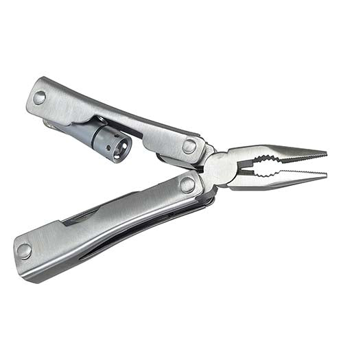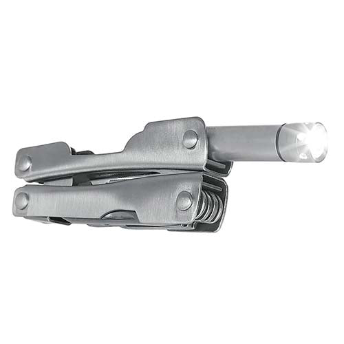 Mini pinzas con 7 funciones. Cuenta con lámpara de 1 LED, navaja, desarmador de cruz, serrucho, destapador con punta de desarmador plano. Incluye funda y 3 baterías de botón.
