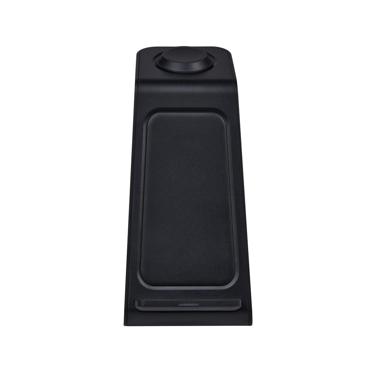 Cargador inalámbrico con triple función. Incluye estación de carga para smartphone, reloj inteligente y audífonos. Wireless de 15W / 10W / 7.5W / 5W / 3W. Incluye cable de 1m con conector tipo C. Compatible con dispositivos que cuenten con tecnología de carga inalámbrica.