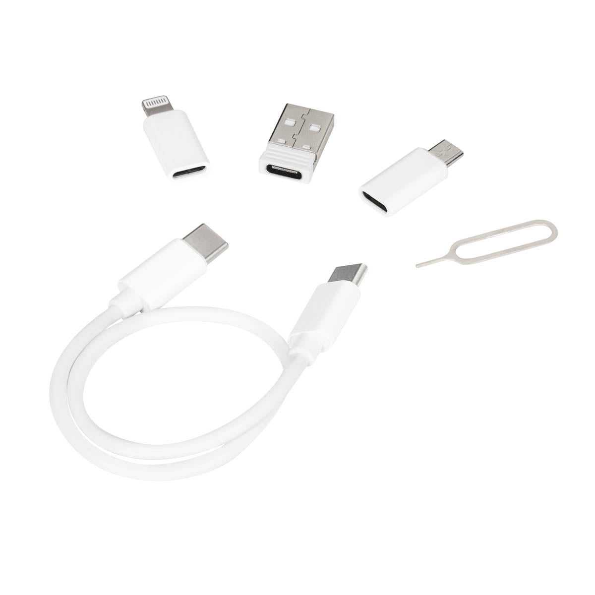 Kit de cable de conexión con adaptadores. Este kit permite tanto la carga rápida de tus dispositivos como la transferencia de datos, asegurando que siempre estés conectado. Equipado con adaptadores intercambiables, es compatible con una amplia gama de dispositivos, ofreciendo una solución integral para tus necesidades tecnológicas. Incluye cable de 25 cm de largo con doble conexión tipo C y permite una carga máxima de 60W. Incluye adaptador tipo C a micro USB, adaptador tipo C a lightning y adaptador USB a tipo C, permitiendo una carga máxima de 2.4A cada uno. Adicional, incorpora ranura para tarjeta SIM, ranura para tarjeta de memoria (no incluidas) y pin para expulsión de tarjeta SIM. Incluye caja individual.