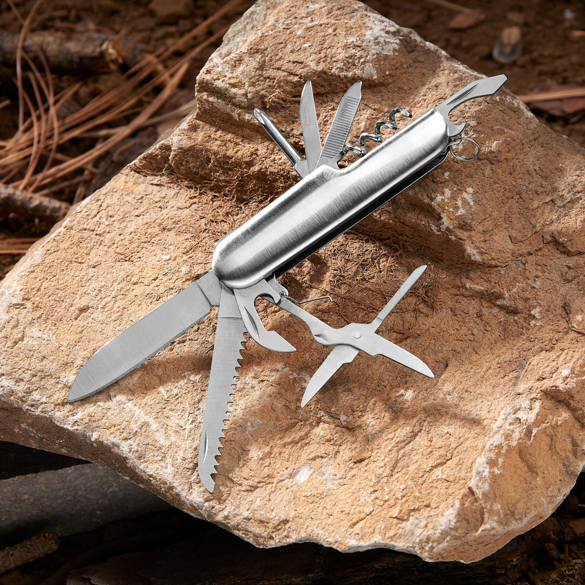 Navaja metálica compacta y resistente. Incluye 9 funciones: Tijeras, navaja, sierra para madera, abrelatas, destornillador plano y de cruz, destapador, lima, punzón plano, sacacorchos y aro para llavero. Combina versatilidad y durabilidad, diseñada para superar cualquier desafío. Incluye caja individual.