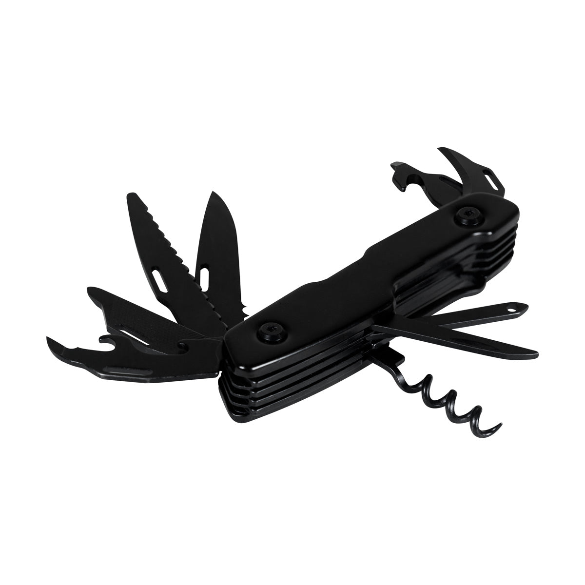 Navaja metálica con 12 funciones. Incluye 1 navaja, 1 destornillador, 1 destornillador plano, 1 destornillador pequeño, 1 abrelatas, 1 lima, 1 sacacorchos, 1 guía de hilo, 1 punzón para cuero, 1 cortador de cajas, 1 destapador y 1 cuchilla pequeña. Incluye caja individual.