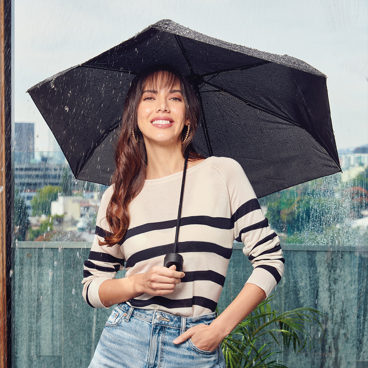 Automático. 6 Paneles. Paraguas de bolsillo con mango de gancho plástico. Incluye estuche metálico.