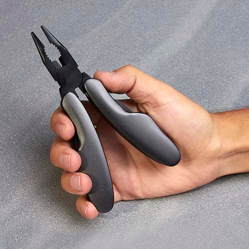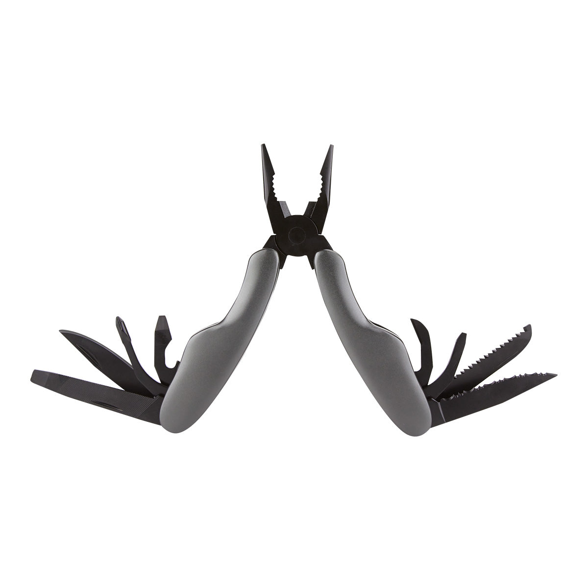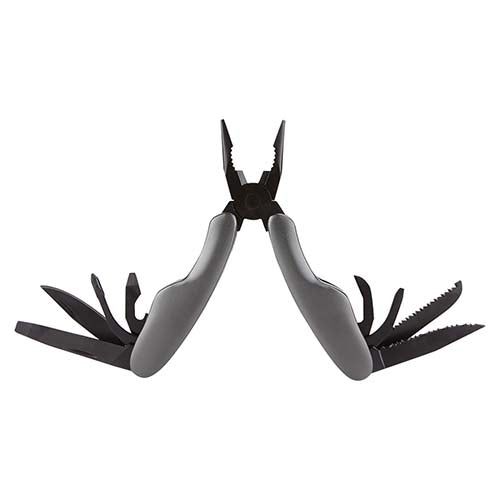 Pinzas con 9 funciones. Incluye lima para uñas, navaja, desarmador de cruz, destapador con desarmador plano, pinzas, navaja de hoja curva, desarmador plano, serrucho, navaja dentada. Incluye funda.