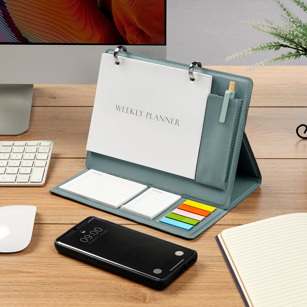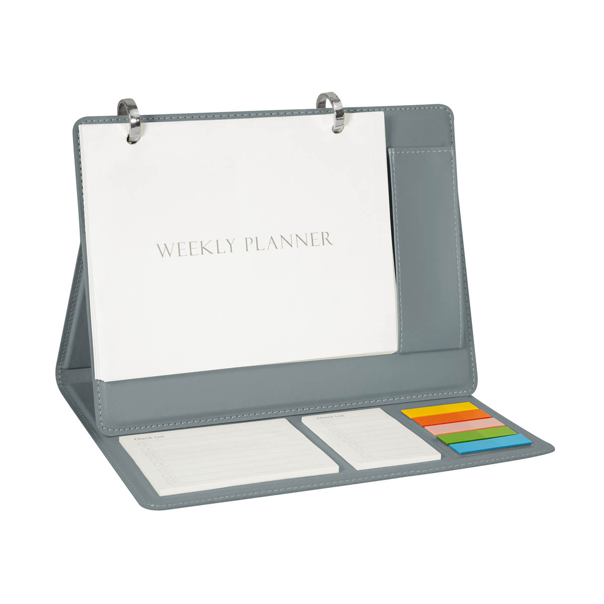 Planeador semanal con diseño plegable. Cubierta de curpiel y dos aros metálicos. Incluye 40 hojas reticuladas y dos blocks de 25 notas cada uno, además de 5 colores diferentes de banderines con 25 notas cada uno y un porta plumas. Su diseño permite desplegarlo para tener tus apuntes a la vista y organizar tus tareas diarias fácilmente.