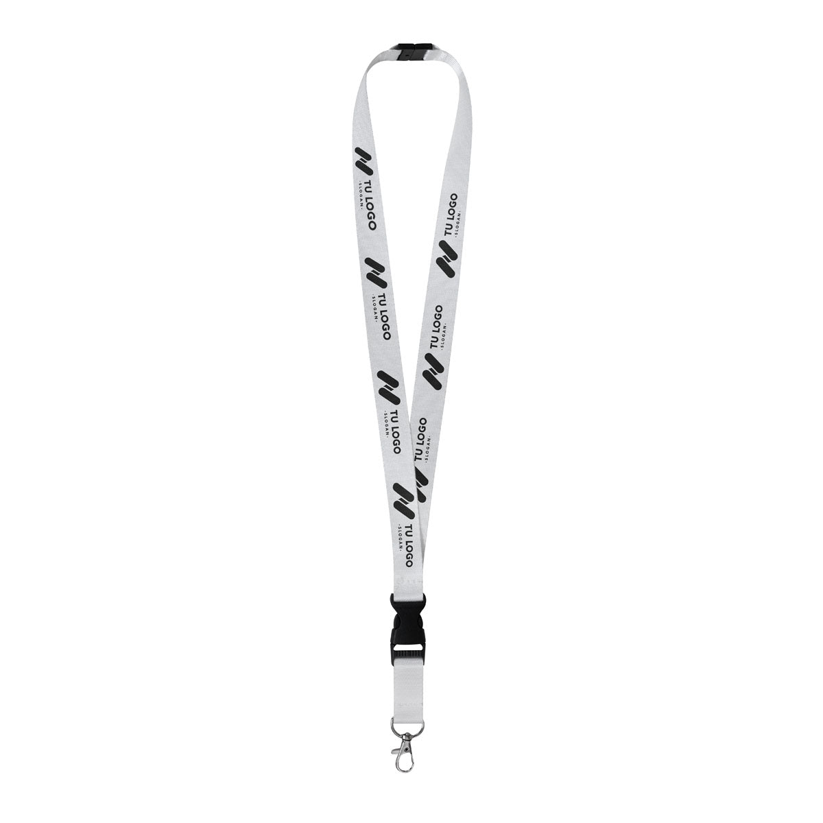 Fabricado con material especial para sublimación. Incluye broche de seguridad, clip desmontable y gancho metálico con giro de 360°.